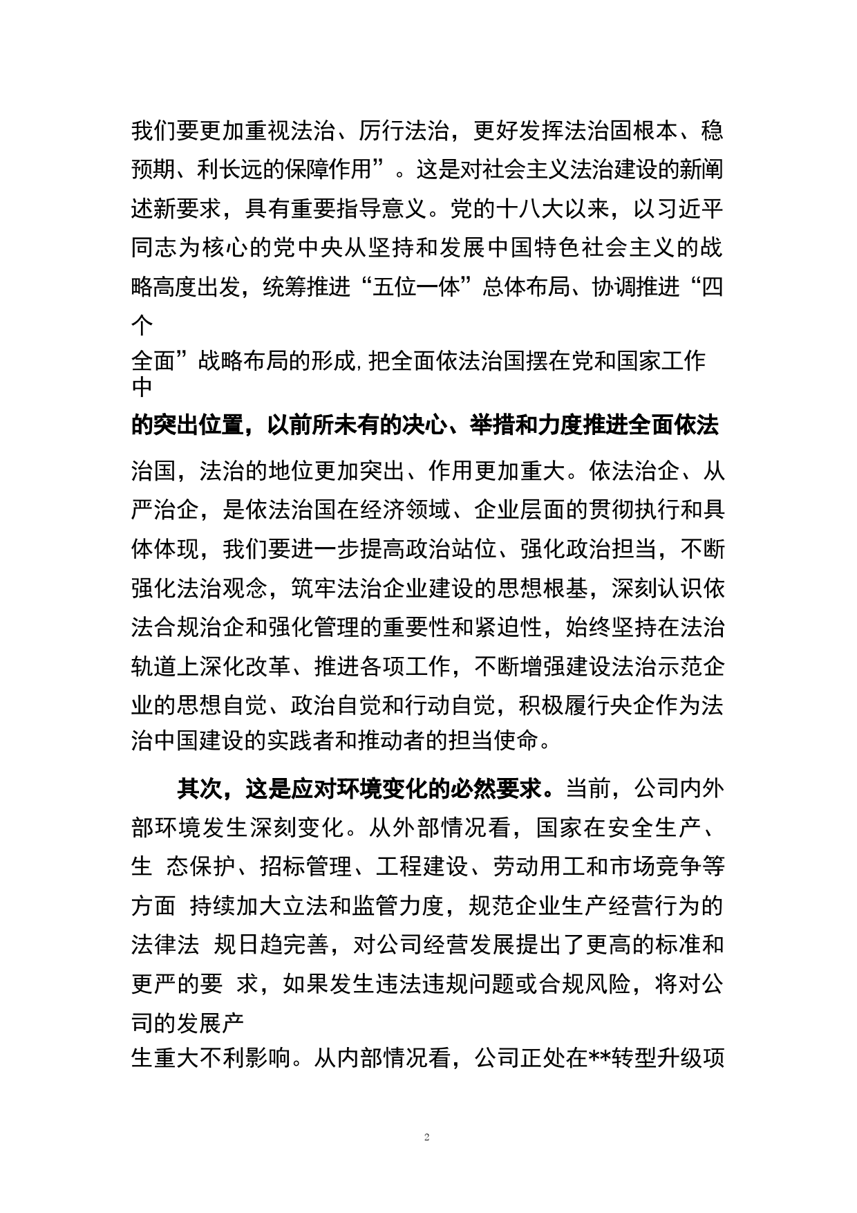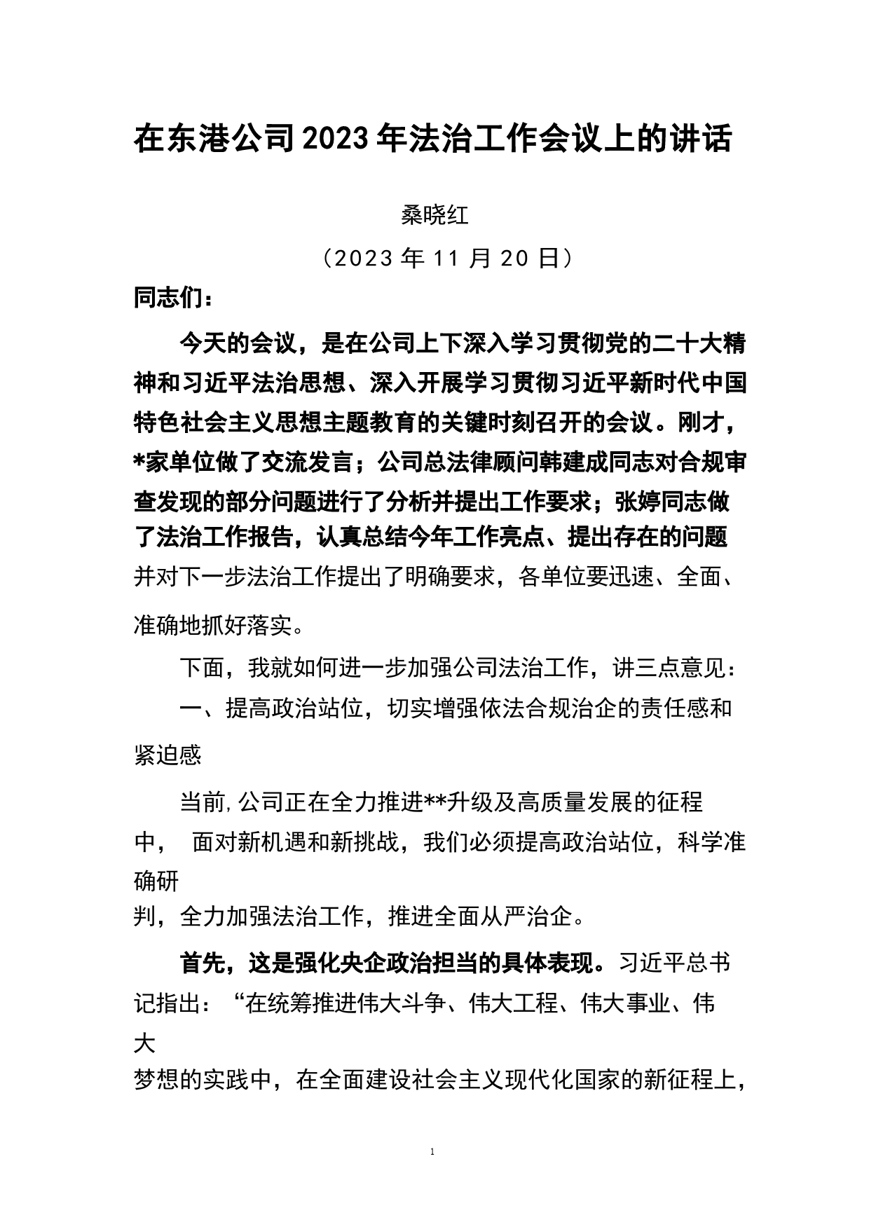 在東港公司2023年法治工作會議上的講話桑曉紅(2023年11月20日)同志們:今天的會議,是在公司上下深入學(xué)習(xí)貫徹黨的二十大精神和習(xí)近平法治思想、深入開展學(xué)習(xí)貫徹習(xí)近平新時代中國特色社會主義思想主題教育的關(guān)鍵時刻召開的會議。剛才,家單位做了交流發(fā)言;公司總法律顧問韓建成同志對合規(guī)審查發(fā)現(xiàn)的部分問題進行了分析并提出工作要求;張婷同志做了法治工作報告,認真總結(jié)今年工作亮點、提出存在的問題并對下一步法治工作提出了明確要求,各單位要迅速、全面、準確地抓好落實。下面,我就如何進一步加強公司法治工作,講三點意見:一、提高政治站位,切實增強依法合規(guī)治...
