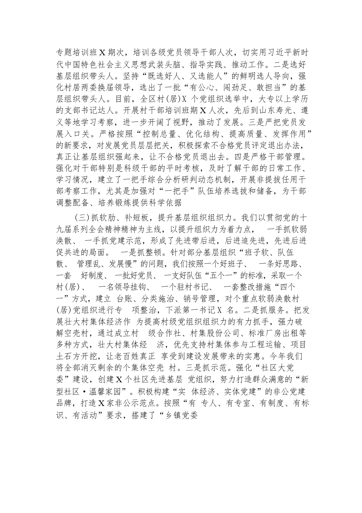 鄉(xiāng)鎮(zhèn)黨委書記黨建工作述職思路六篇【篇1】鄉(xiāng)鎮(zhèn)黨委書記黨建工作述職思路今年以來,在市委、市政府的正確領導下,我始終把深入貫徹落實黨的十九屆系列全會精神作為推進基層黨建工作的源動力,認真思考、謀劃基層黨建工作,認真履行基層黨建“第一責任人”職責,充分發(fā)揮黨委班子總攬全局、協(xié)調(diào)各方的作用,把黨建工作與經(jīng)濟社會建設同安排、同部署,有效增強了基層組織的凝聚力、戰(zhàn)斗力和創(chuàng)造力。現(xiàn)將工作情況述職如下:一、主要做法(一)抓書記、書記抓,強化第一責任人職責。堅持把抓黨組織書記這個一把手作為抓好黨建工作的有效方法,健全黨委著力管、書記帶頭抓的黨建...