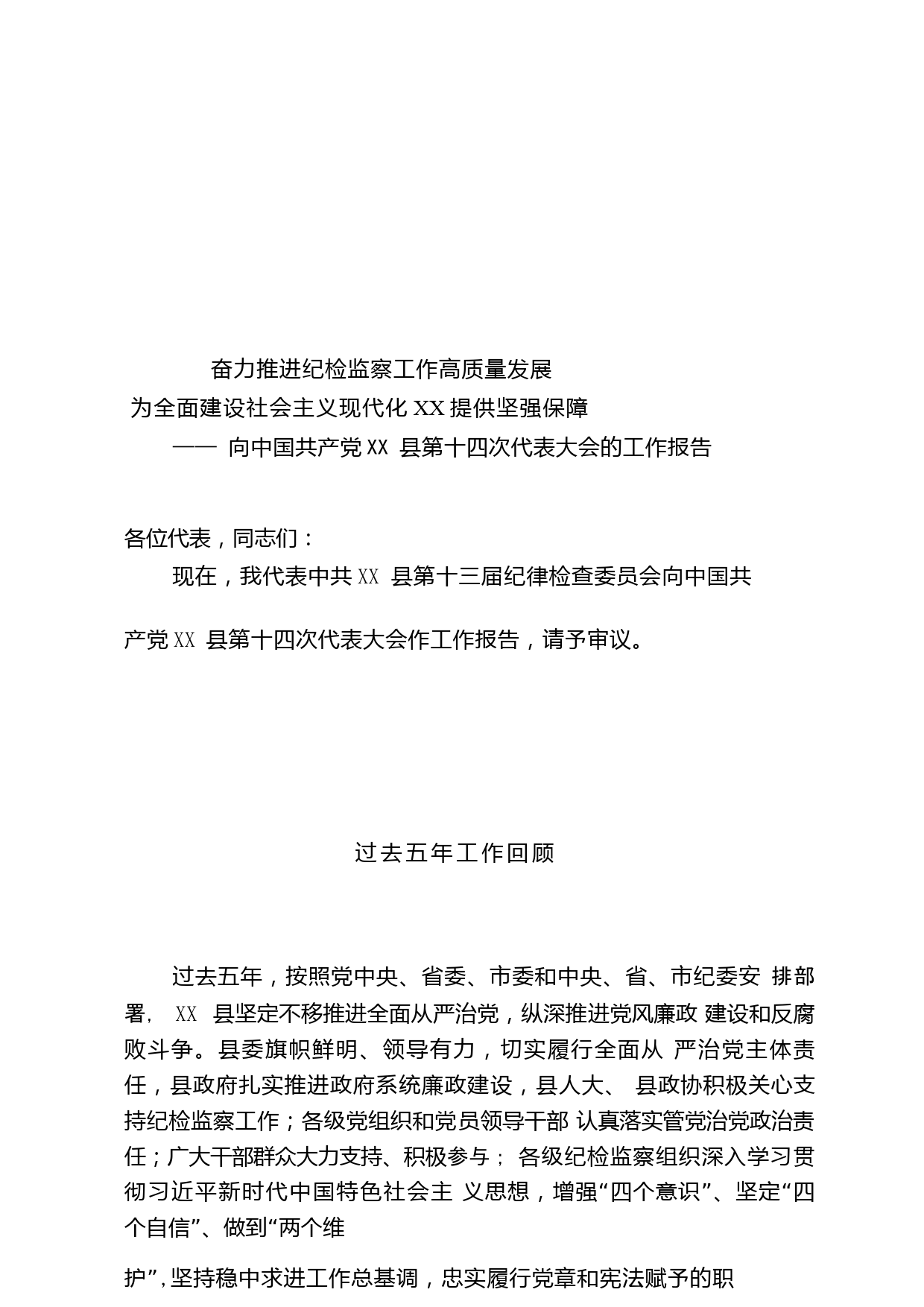 奮力推進(jìn)紀(jì)檢監(jiān)察工作高質(zhì)量發(fā)展為全面建設(shè)社會(huì)主義現(xiàn)代化XX提供堅(jiān)強(qiáng)保障——向中國(guó)共產(chǎn)黨XX縣第十四次代表大會(huì)的工作報(bào)告各位代表,同志們:現(xiàn)在,我代表中共XX縣第十三屆紀(jì)律檢查委員會(huì)向中國(guó)共產(chǎn)黨XX縣第十四次代表大會(huì)作工作報(bào)告,請(qǐng)予審議。過去五年工作回顧過去五年,按照黨中央、省委、市委和中央、省、市紀(jì)委安排部署,XX縣堅(jiān)定不移推進(jìn)全面從嚴(yán)治黨,縱深推進(jìn)黨風(fēng)廉政建設(shè)和反腐敗斗爭(zhēng)。縣委旗幟鮮明、領(lǐng)導(dǎo)有力,切實(shí)履行全面從嚴(yán)治黨主體責(zé)任,縣政府扎實(shí)推進(jìn)政府系統(tǒng)廉政建設(shè),縣人大、縣政協(xié)積極關(guān)心支持紀(jì)檢監(jiān)察工作;各級(jí)黨組織和黨員領(lǐng)導(dǎo)干部認(rèn)真落實(shí)管黨...