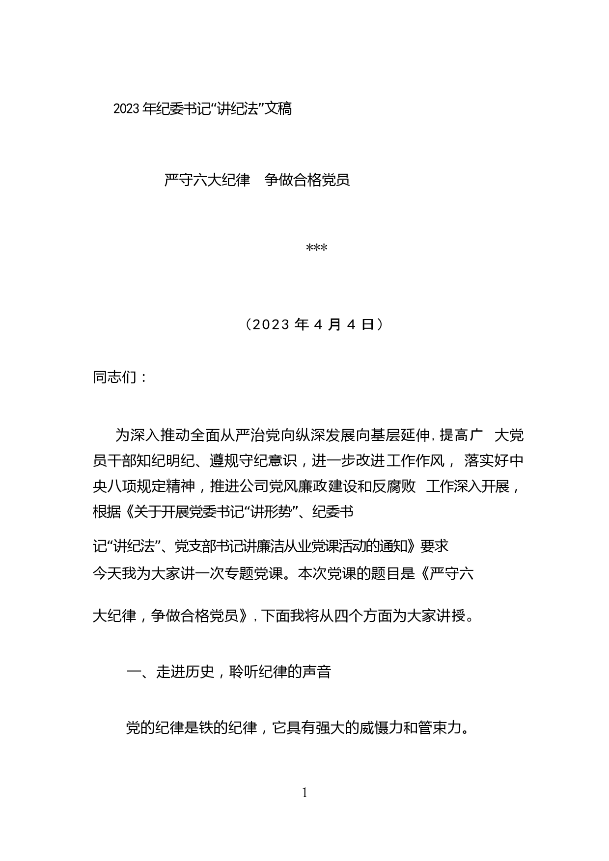 2023年紀委書記“講紀法”文稿嚴守六大紀律爭做合格黨員(2023年4月4日)同志們:為深入推動全面從嚴治黨向縱深發(fā)展向基層延伸,提高廣大黨員干部知紀明紀、遵規(guī)守紀意識,進一步改進工作作風,落實好中央八項規(guī)定精神,推進公司黨風廉政建設和反腐敗工作深入開展,根據(jù)《關于開展黨委書記“講形勢”、紀委書記“講紀法”、黨支部書記講廉潔從業(yè)黨課活動的通知》要求今天我為大家講一次專題黨課。本次黨課的題目是《嚴守六大紀律,爭做合格黨員》,下面我將從四個方面為大家講授。一、走進歷史,聆聽紀律的聲音黨的紀律是鐵的紀律,它具有強大的威懾力和管束力。1回顧我們黨1...