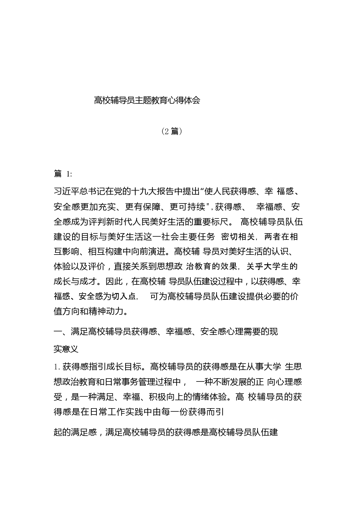 高校輔導(dǎo)員主題教育心得體會(huì)(2篇)篇1:習(xí)近平總書記在黨的十九大報(bào)告中提出“使人民獲得感、幸福感、安全感更加充實(shí)、更有保障、更可持續(xù)",獲得感、幸福感、安全感成為評(píng)判新時(shí)代人民美好生活的重要標(biāo)尺。高校輔導(dǎo)員隊(duì)伍建設(shè)的目標(biāo)與美好生活這一社會(huì)主要任務(wù)密切相關(guān),兩者在相互影響、相互構(gòu)建中向前演進(jìn)。高校輔導(dǎo)員對(duì)美好生活的認(rèn)識(shí)、體驗(yàn)以及評(píng)價(jià),直接關(guān)系到思想政治教育的效果,關(guān)乎大學(xué)生的成長與成才。因此,在高校輔導(dǎo)員隊(duì)伍建設(shè)過程中,以獲得感、幸福感、安全感為切入點(diǎn),可為高校輔導(dǎo)員隊(duì)伍建設(shè)提供必要的價(jià)值方向和精神動(dòng)力。一、滿足高校輔導(dǎo)員獲得感、幸...