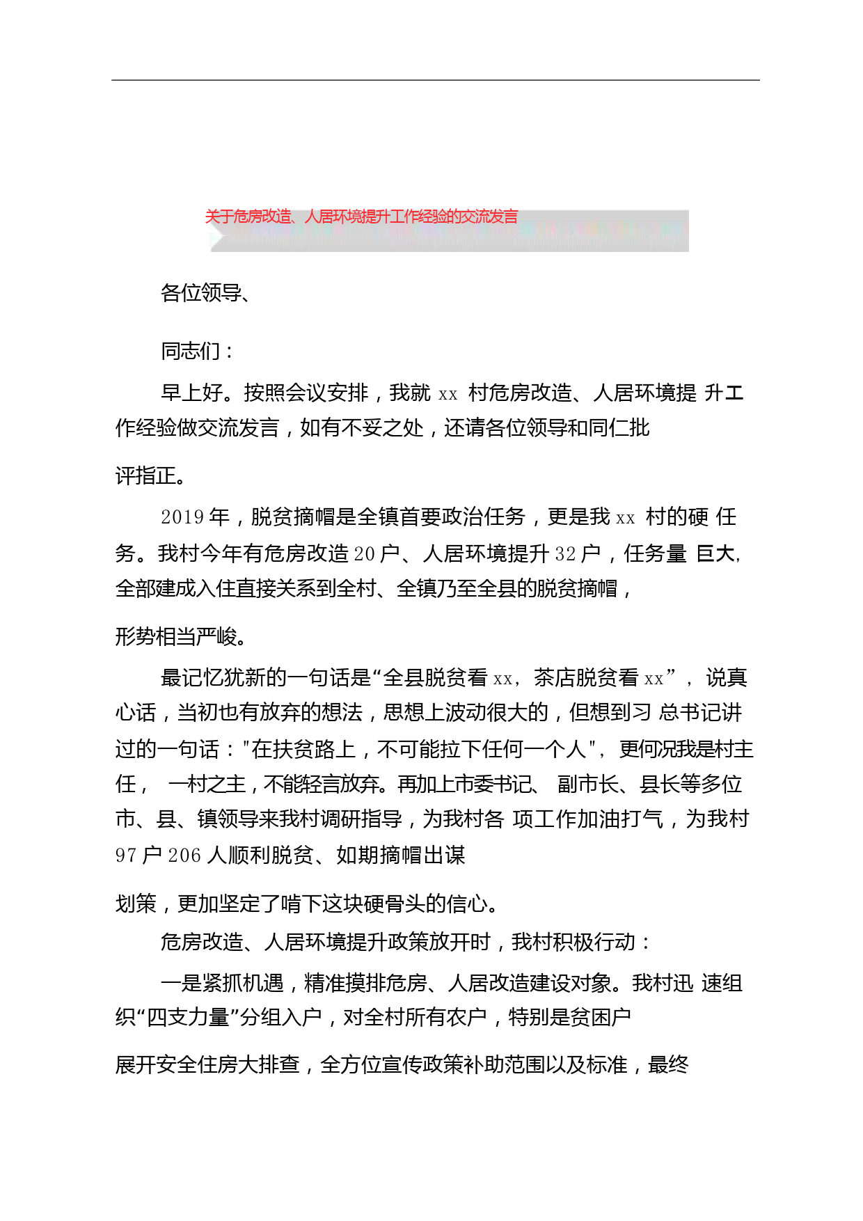 關(guān)于危房改造、人居環(huán)境提升工作經(jīng)驗(yàn)的交流發(fā)言各位領(lǐng)導(dǎo)、同志們:早上好。按照會(huì)議安排,我就xx村危房改造、人居環(huán)境提升工作經(jīng)驗(yàn)做交流發(fā)言,如有不妥之處,還請(qǐng)各位領(lǐng)導(dǎo)和同仁批評(píng)指正。2019年,脫貧摘帽是全鎮(zhèn)首要政治任務(wù),更是我xx村的硬任務(wù)。我村今年有危房改造20戶、人居環(huán)境提升32戶,任務(wù)量巨大,全部建成入住直接關(guān)系到全村、全鎮(zhèn)乃至全縣的脫貧摘帽,形勢(shì)相當(dāng)嚴(yán)峻。最記憶猶新的一句話是“全縣脫貧看xx,茶店脫貧看xx”,說(shuō)真心話,當(dāng)初也有放棄的想法,思想上波動(dòng)很大的,但想到習(xí)總書(shū)記講過(guò)的一句話:"在扶貧路上,不可能拉下任何一個(gè)人",更何況我是村主任...
