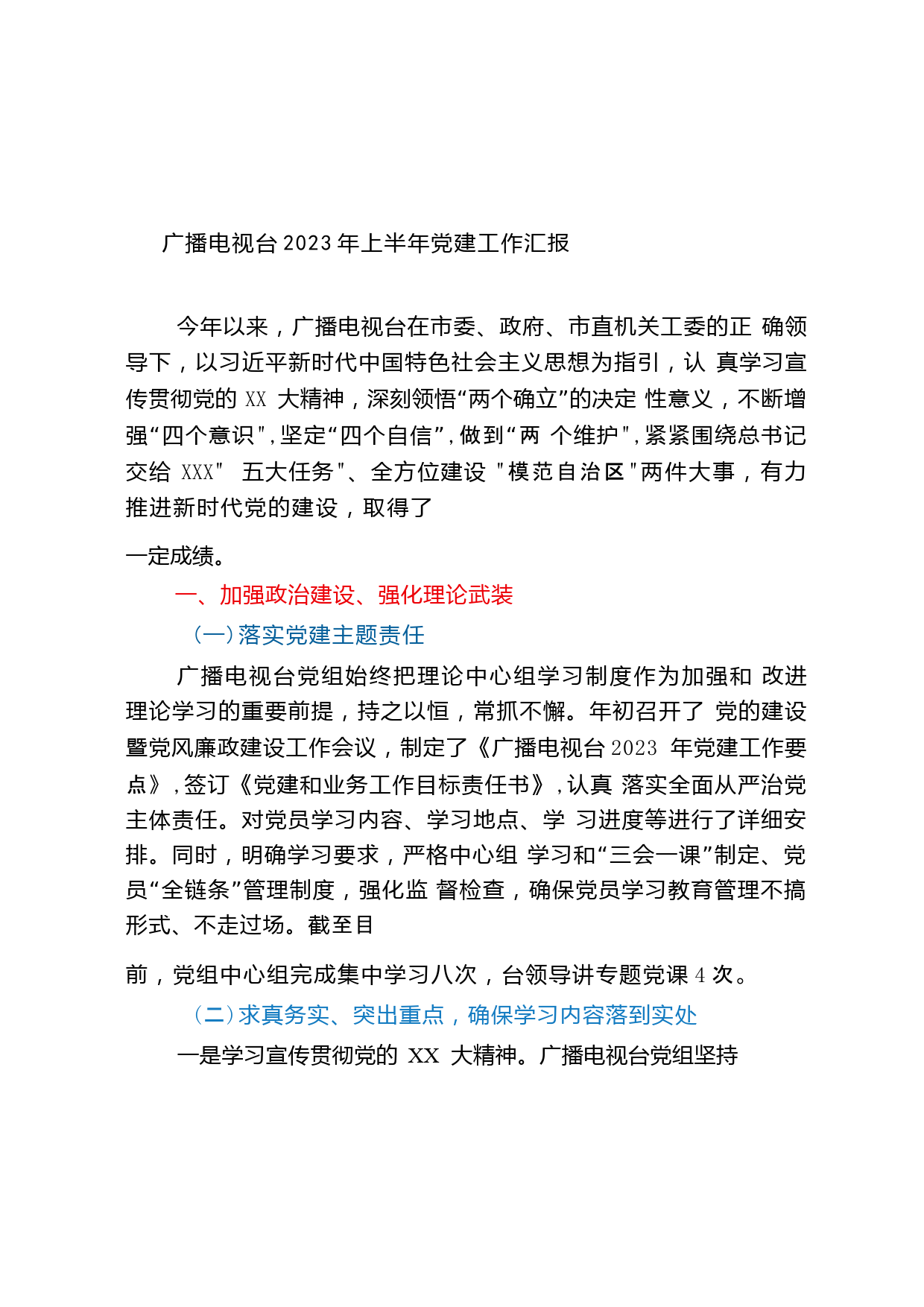 廣播電視臺(tái)2023年上半年黨建工作匯報(bào)今年以來,廣播電視臺(tái)在市委、政府、市直機(jī)關(guān)工委的正確領(lǐng)導(dǎo)下,以習(xí)近平新時(shí)代中國特色社會(huì)主義思想為指引,認(rèn)真學(xué)習(xí)宣傳貫徹黨的XX大精神,深刻領(lǐng)悟“兩個(gè)確立”的決定性意義,不斷增強(qiáng)“四個(gè)意識(shí)",堅(jiān)定“四個(gè)自信”,做到“兩個(gè)維護(hù)",緊緊圍繞總書記交給XXX"五大任務(wù)"、全方位建設(shè)"模范自治區(qū)"兩件大事,有力推進(jìn)新時(shí)代黨的建設(shè),取得了一定成績(jī)。一、加強(qiáng)政治建設(shè)、強(qiáng)化理論武裝(一)落實(shí)黨建主題責(zé)任廣播電視臺(tái)黨組始終把理論中心組學(xué)習(xí)制度作為加強(qiáng)和改進(jìn)理論學(xué)習(xí)的重要前提,持之以恒,常抓不懈。年初召開了黨的建設(shè)暨黨風(fēng)廉政建...
