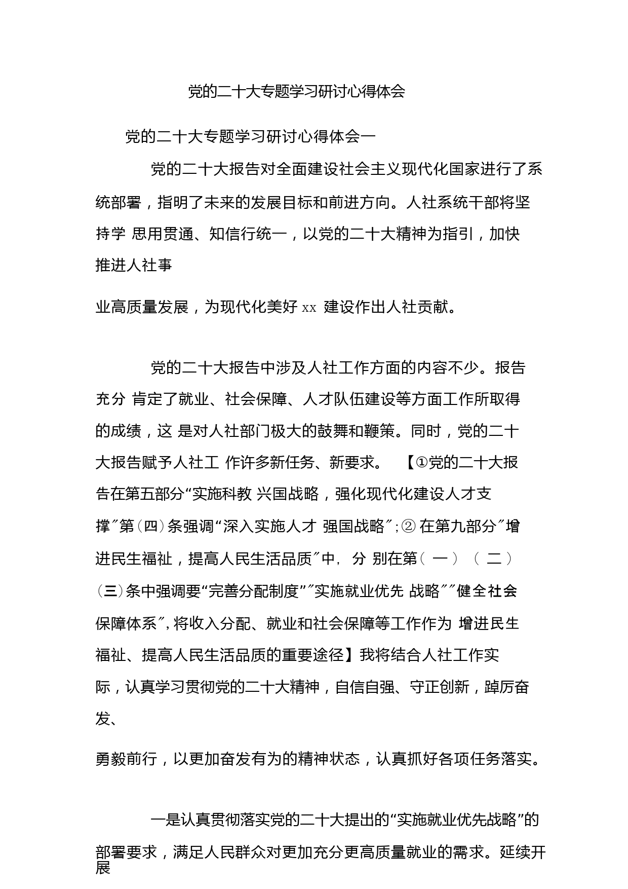 黨的二十大專題學習研討心得體會黨的二十大專題學習研討心得體會一黨的二十大報告對全面建設(shè)社會主義現(xiàn)代化國家進行了系統(tǒng)部署,指明了未來的發(fā)展目標和前進方向。人社系統(tǒng)干部將堅持學思用貫通、知信行統(tǒng)一,以黨的二十大精神為指引,加快推進人社事業(yè)高質(zhì)量發(fā)展,為現(xiàn)代化美好xx建設(shè)作出人社貢獻。黨的二十大報告中涉及人社工作方面的內(nèi)容不少。報告充分肯定了就業(yè)、社會保障、人才隊伍建設(shè)等方面工作所取得的成績,這是對人社部門極大的鼓舞和鞭策。同時,黨的二十大報告賦予人社工作許多新任務、新要求?!劲冱h的二十大報告在第五部分“實施科教興國戰(zhàn)略,強化現(xiàn)代化...