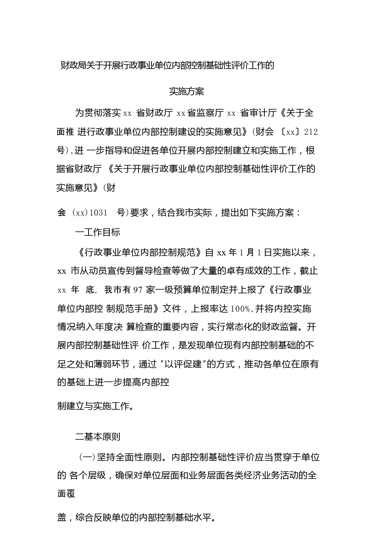財(cái)政局關(guān)于開(kāi)展行政事業(yè)單位內(nèi)部控制基礎(chǔ)性評(píng)價(jià)工作的實(shí)施方案為貫徹落實(shí)xx省財(cái)政廳xx省監(jiān)察廳xx省審計(jì)廳《關(guān)于全面推進(jìn)行政事業(yè)單位內(nèi)部控制建設(shè)的實(shí)施意見(jiàn)》(財(cái)會(huì)〔xx〕212號(hào)),進(jìn)一步指導(dǎo)和促進(jìn)各單位開(kāi)展內(nèi)部控制建立和實(shí)施工作,根據(jù)省財(cái)政廳《關(guān)于開(kāi)展行政事業(yè)單位內(nèi)部控制基礎(chǔ)性評(píng)價(jià)工作的實(shí)施意見(jiàn)》(財(cái)會(huì)(xx)1031號(hào))要求,結(jié)合我市實(shí)際,提出如下實(shí)施方案:一工作目標(biāo)《行政事業(yè)單位內(nèi)部控制規(guī)范》自xx年1月1日實(shí)施以來(lái),xx市從動(dòng)員宣傳到督導(dǎo)檢查等做了大量的卓有成效的工作,截止xx年底,我市有97家一級(jí)預(yù)算單位制定并上報(bào)了《行政事業(yè)單位內(nèi)部控制規(guī)范手冊(cè)》文...