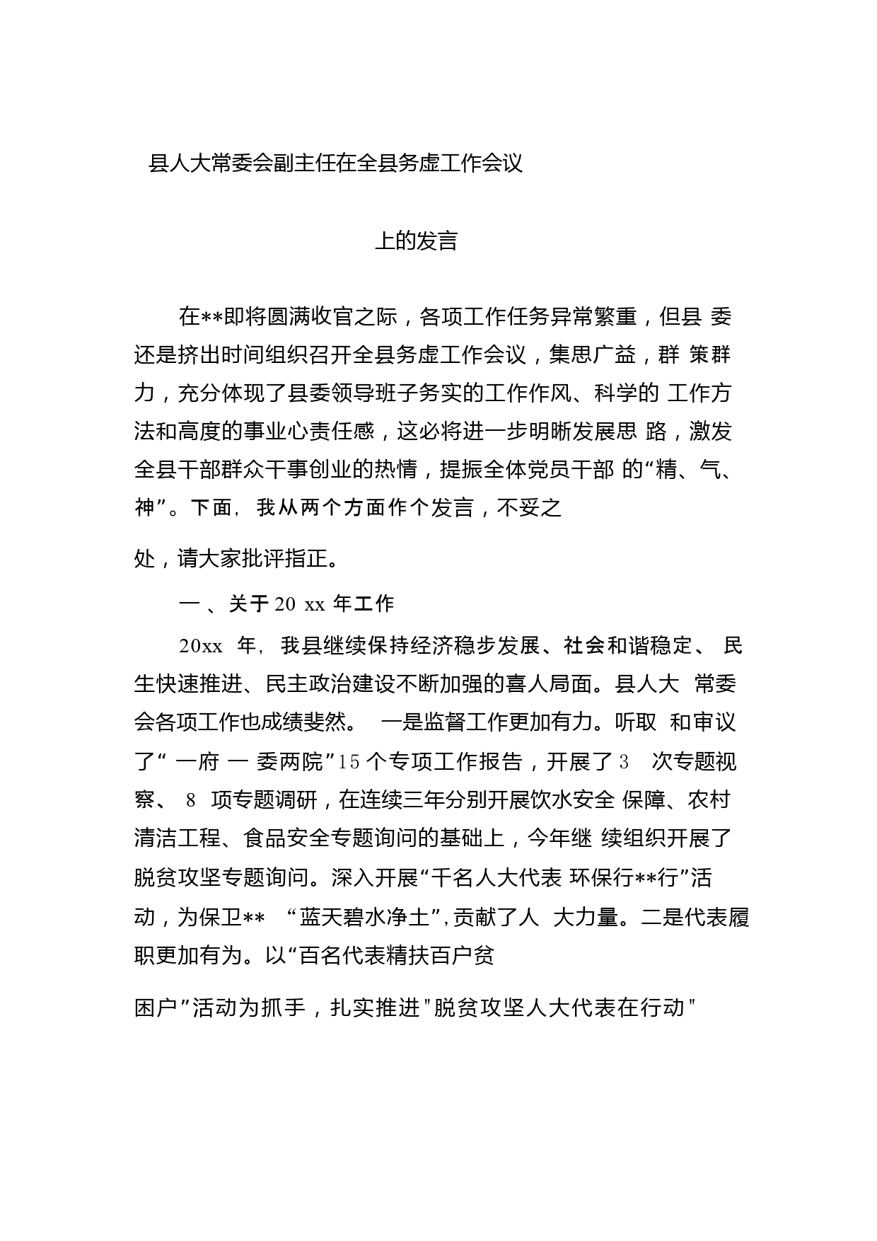縣人大常委會(huì)副主任在全縣務(wù)虛工作會(huì)議上的發(fā)言在即將圓滿收官之際,各項(xiàng)工作任務(wù)異常繁重,但縣委還是擠出時(shí)間組織召開(kāi)全縣務(wù)虛工作會(huì)議,集思廣益,群策群力,充分體現(xiàn)了縣委領(lǐng)導(dǎo)班子務(wù)實(shí)的工作作風(fēng)、科學(xué)的工作方法和高度的事業(yè)心責(zé)任感,這必將進(jìn)一步明晰發(fā)展思路,激發(fā)全縣干部群眾干事創(chuàng)業(yè)的熱情,提振全體黨員干部的“精、氣、神”。下面,我從兩個(gè)方面作個(gè)發(fā)言,不妥之處,請(qǐng)大家批評(píng)指正。一、關(guān)于20xx年工作20xx年,我縣繼續(xù)保持經(jīng)濟(jì)穩(wěn)步發(fā)展、社會(huì)和諧穩(wěn)定、民生快速推進(jìn)、民主政治建設(shè)不斷加強(qiáng)的喜人局面??h人大常委會(huì)各項(xiàng)工作也成績(jī)斐然。一是監(jiān)督工作更加...