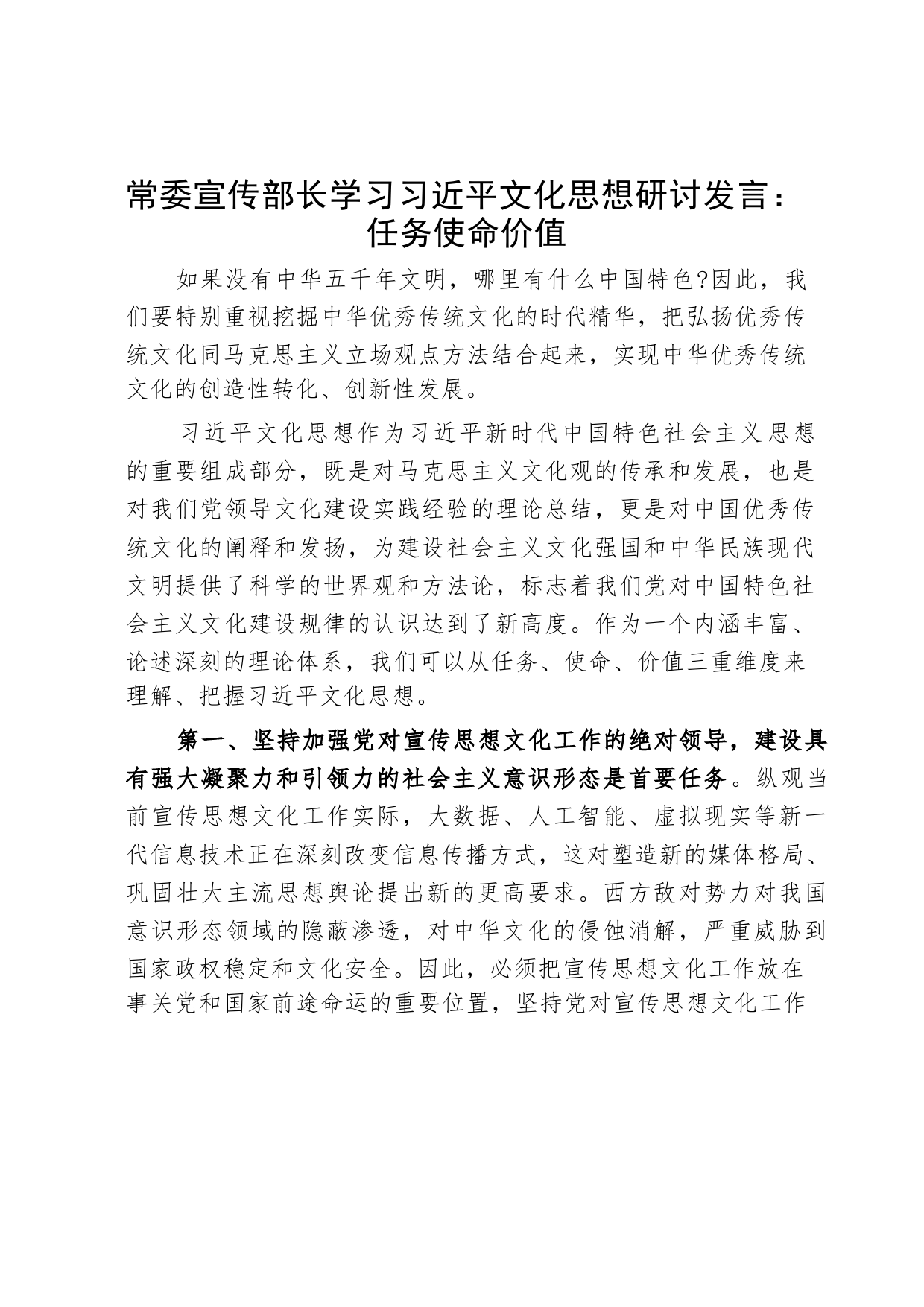 常委宣傳部長(zhǎng)學(xué)習(xí)習(xí)近平文化思想研討發(fā)言:任務(wù) 使命 價(jià)值VIP免費(fèi)