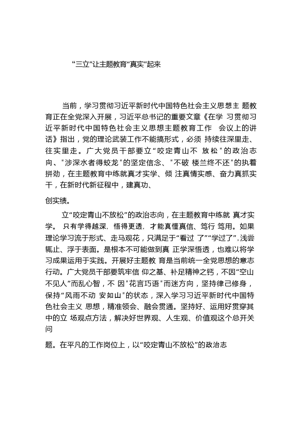 “三立”讓主題教育“真實”起來當前,學習貫徹習近平新時代中國特色社會主義思想主題教育正在全黨深入開展,習近平總書記的重要文章《在學習貫徹習近平新時代中國特色社會主義思想主題教育工作會議上的講話》指出,黨的理論武裝工作不能搞形式,必須持續(xù)往深里走、往實里走。廣大黨員干部要立“咬定青山不放松"的政治志向、"涉深水者得蛟龍"的堅定信念、"不破樓蘭終不還"的執(zhí)著拼勁,在主題教育中練就真才實學、傾注真情實感、奮力真抓實干,在新時代新征程中,建真功、創(chuàng)實績。立“咬定青山不放松”的政治志向,在主題教育中練就真才實學。只有學得越深,悟得更透,才...