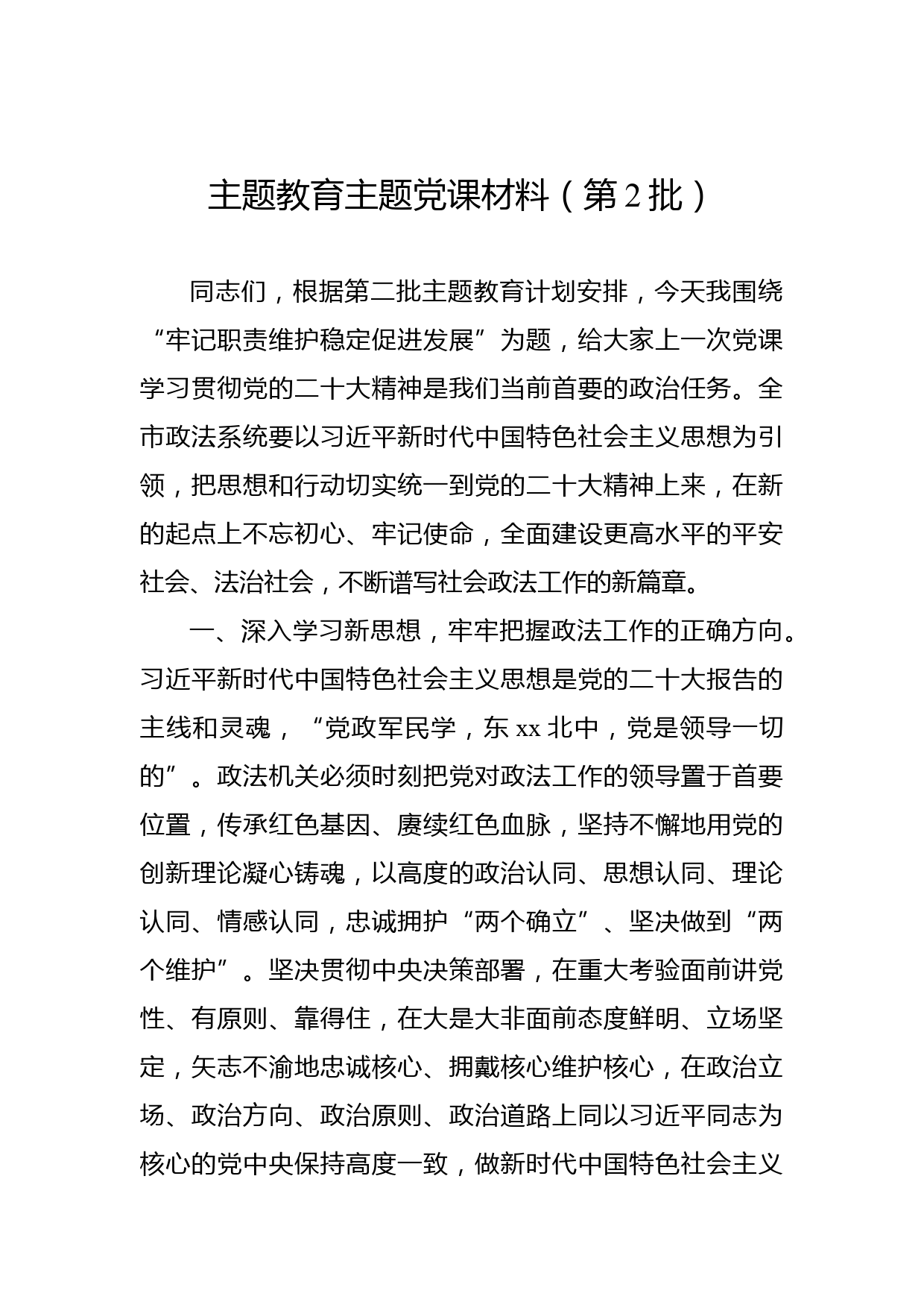 主題教育主題黨課材料(第2批)同志們,根據(jù)第二批主題教育計劃安排,今天我圍繞“牢記職責維護穩(wěn)定促進發(fā)展”為題,給大家上一次黨課學習貫徹黨的二十大精神是我們當前首要的政治任務。全市政法系統(tǒng)要以習近平新時代中國特色社會主義思想為引領,把思想和行動切實統(tǒng)一到黨的二十大精神上來,在新的起點上不忘初心、牢記使命,全面建設更高水平的平安社會、法治社會,不斷譜寫社會政法工作的新篇章。一、深入學習新思想,牢牢把握政法工作的正確方向。習近平新時代中國特色社會主義思想是黨的二十大報告的主線和靈魂,“黨政軍民學,東xx北中,黨是領導一切的”。政法機...