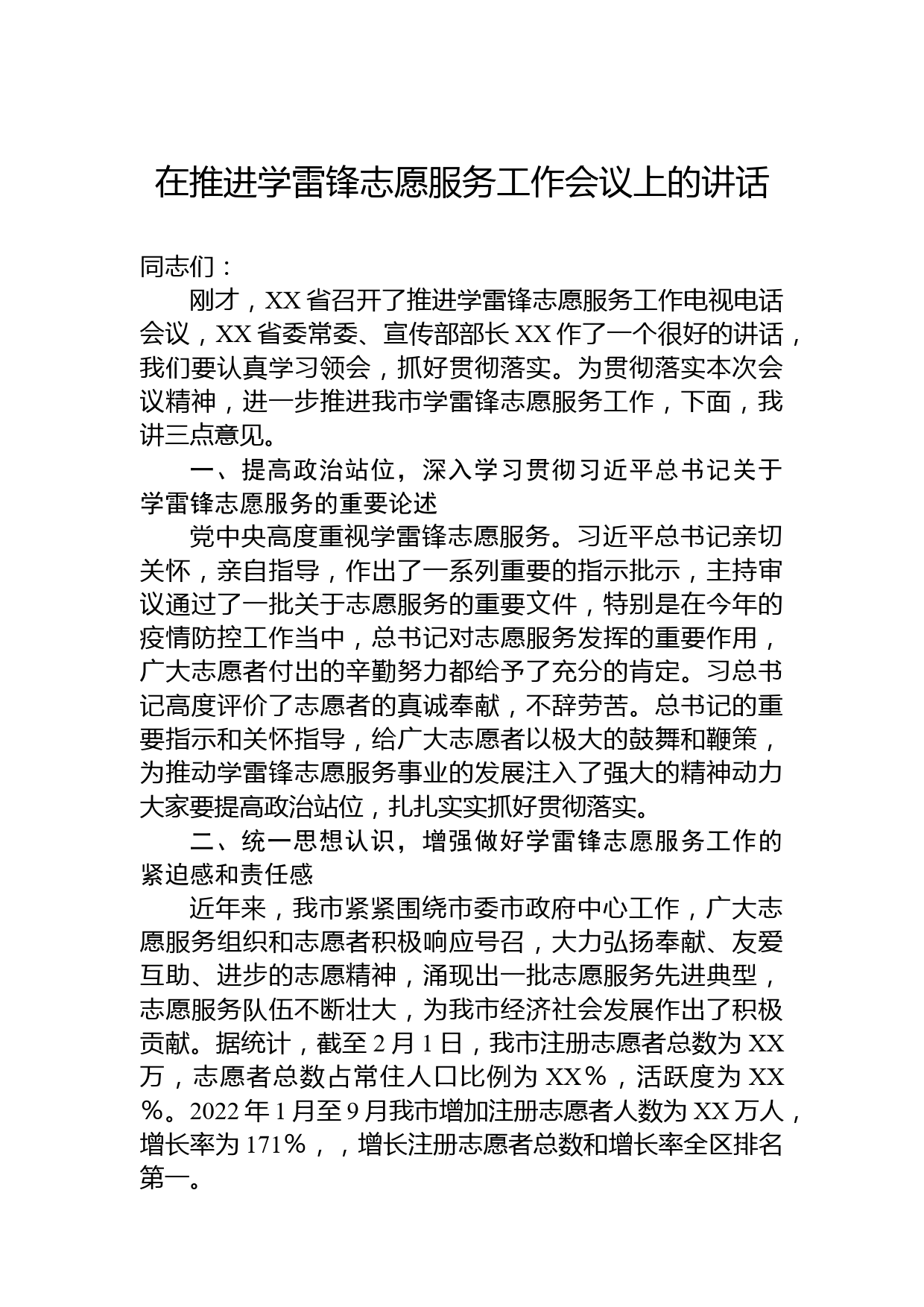 在推進(jìn)學(xué)雷鋒志愿服務(wù)工作會(huì)議上的講話同志們:剛才,XX省召開了推進(jìn)學(xué)雷鋒志愿服務(wù)工作電視電話會(huì)議,XX省委常委、宣傳部部長(zhǎng)XX作了一個(gè)很好的講話,我們要認(rèn)真學(xué)習(xí)領(lǐng)會(huì),抓好貫徹落實(shí)。為貫徹落實(shí)本次會(huì)議精神,進(jìn)一步推進(jìn)我市學(xué)雷鋒志愿服務(wù)工作,下面,我講三點(diǎn)意見。一、提高政治站位,深入學(xué)習(xí)貫徹習(xí)近平總書記關(guān)于學(xué)雷鋒志愿服務(wù)的重要論述黨中央高度重視學(xué)雷鋒志愿服務(wù)。習(xí)近平總書記親切關(guān)懷,親自指導(dǎo),作出了一系列重要的指示批示,主持審議通過(guò)了一批關(guān)于志愿服務(wù)的重要文件,特別是在今年的疫情防控工作當(dāng)中,總書記對(duì)志愿服務(wù)發(fā)揮的重要作用,廣大志愿者付...