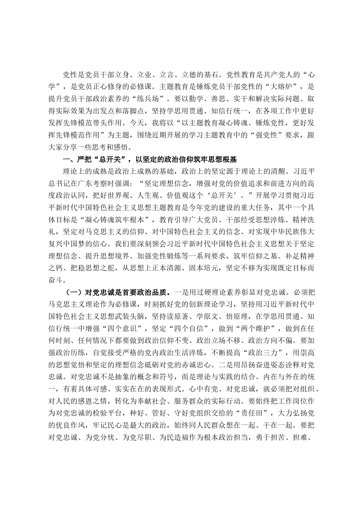 黨性是黨員干部立身、立業(yè)、立言、立德的基石。黨性教育是共產(chǎn)黨人的“心學”,是黨員正心修身的必修課。主題教育是錘煉黨員干部黨性的“大熔爐”,是提升黨員干部政治素養(yǎng)的“練兵場”。要以勤學、善思、實干和解決實際問題、取得實際效果為出發(fā)點和落腳點,堅持學思用貫通、知信行統(tǒng)一,在各項工作中更好發(fā)揮先鋒模范帶頭作用。今天,我將以“以主題教育凝心鑄魂、錘煉黨性,更好發(fā)揮先鋒模范作用”為主題,圍繞近期開展的學習主題教育中的“強黨性”要求,跟大家分享一些思考和感悟。一、嚴把“總開關”,以堅定的政治信仰筑牢思想根基理論上的成熟是政治上成熟的基礎...
