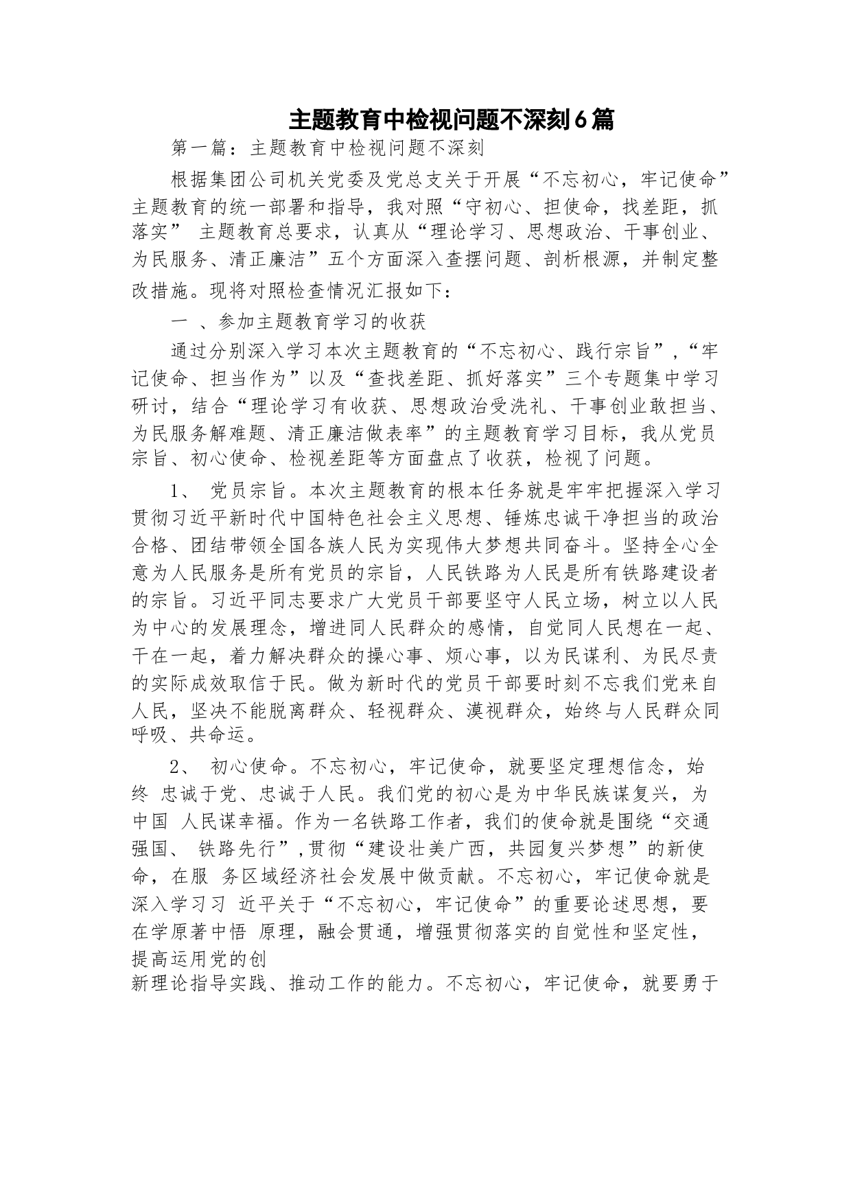 主題教育中檢視問題不深刻6篇第一篇:主題教育中檢視問題不深刻根據(jù)集團公司機關黨委及黨總支關于開展“不忘初心,牢記使命”主題教育的統(tǒng)一部署和指導,我對照“守初心、擔使命,找差距,抓落實”主題教育總要求,認真從“理論學習、思想政治、干事創(chuàng)業(yè)、為民服務、清正廉潔”五個方面深入查擺問題、剖析根源,并制定整改措施。現(xiàn)將對照檢查情況匯報如下:一、參加主題教育學習的收獲通過分別深入學習本次主題教育的“不忘初心、踐行宗旨”,“牢記使命、擔當作為”以及“查找差距、抓好落實”三個專題集中學習研討,結合“理論學習有收獲、思想政治受洗禮、干事創(chuàng)業(yè)敢擔...