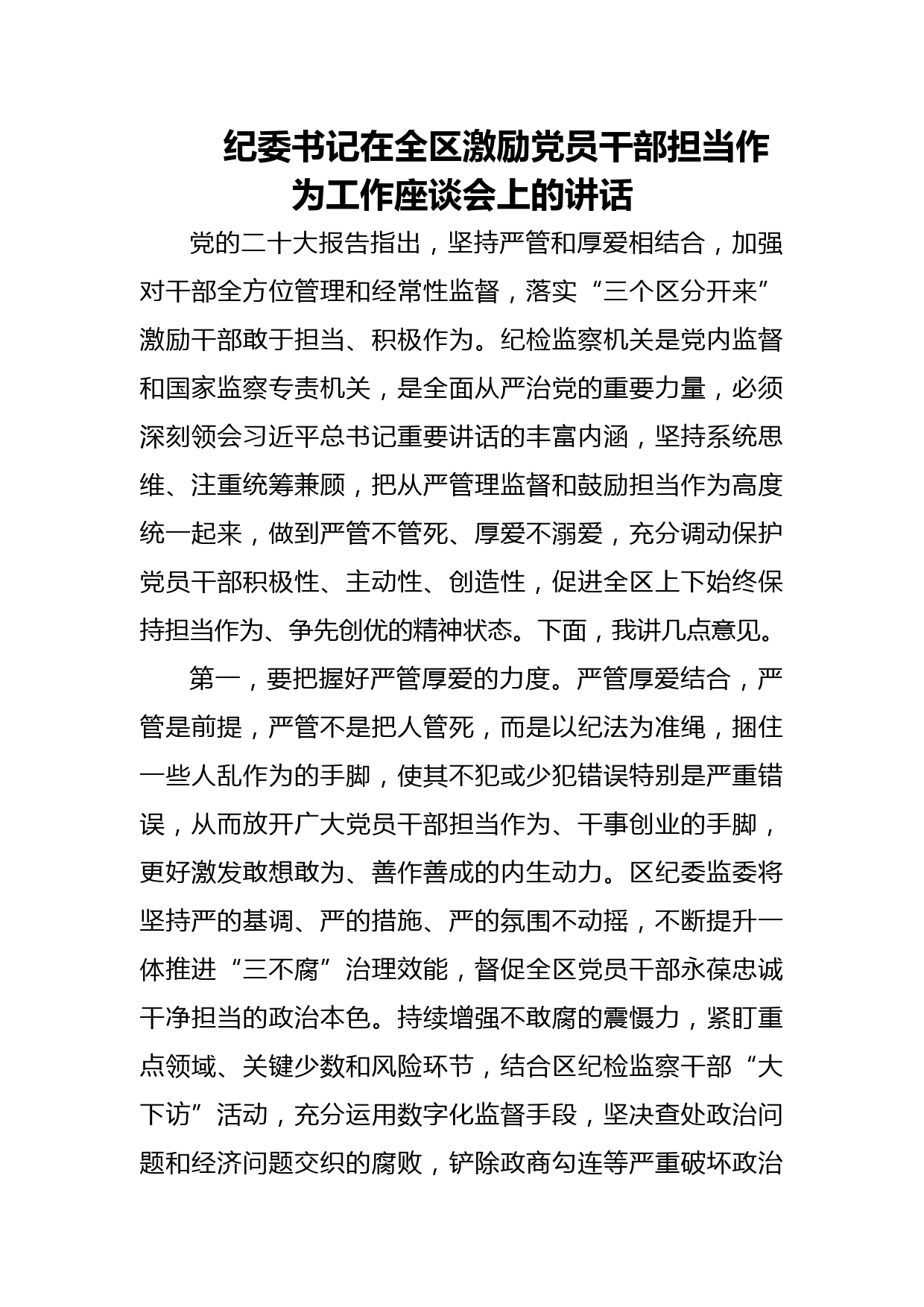 紀(jì)委書記在全區(qū)激勵黨員干部擔(dān)當(dāng)作為工作座談會上的講話黨的二十大報告指出,堅持嚴(yán)管和厚愛相結(jié)合,加強對干部全方位管理和經(jīng)常性監(jiān)督,落實“三個區(qū)分開來”激勵干部敢于擔(dān)當(dāng)、積極作為。紀(jì)檢監(jiān)察機關(guān)是黨內(nèi)監(jiān)督和國家監(jiān)察專責(zé)機關(guān),是全面從嚴(yán)治黨的重要力量,必須深刻領(lǐng)會習(xí)近平總書記重要講話的豐富內(nèi)涵,堅持系統(tǒng)思維、注重統(tǒng)籌兼顧,把從嚴(yán)管理監(jiān)督和鼓勵擔(dān)當(dāng)作為高度統(tǒng)一起來,做到嚴(yán)管不管死、厚愛不溺愛,充分調(diào)動保護(hù)黨員干部積極性、主動性、創(chuàng)造性,促進(jìn)全區(qū)上下始終保持擔(dān)當(dāng)作為、爭先創(chuàng)優(yōu)的精神狀態(tài)。下面,我講幾點意見。第一,要把握好嚴(yán)管厚愛的力度。...