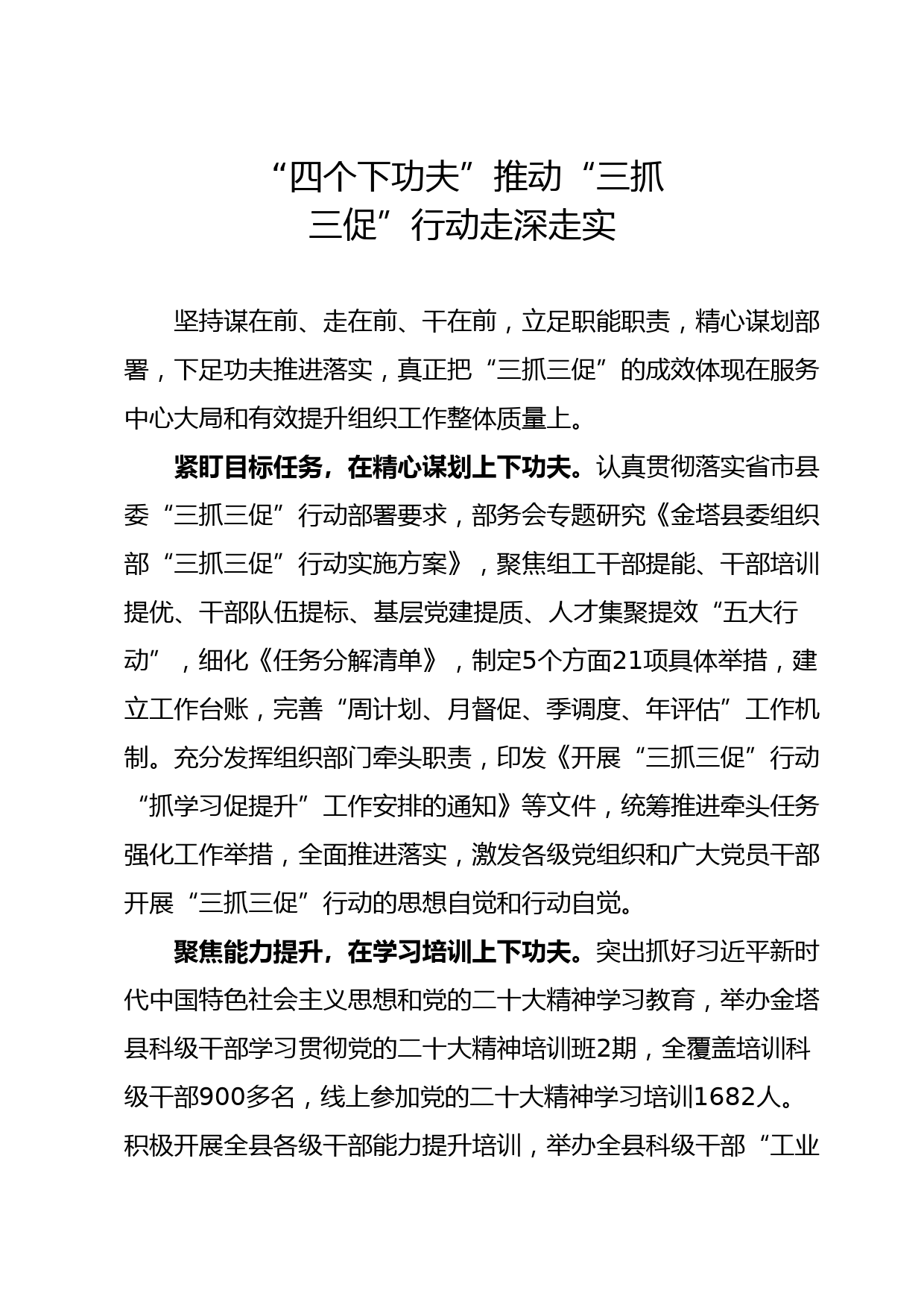 “四個(gè)下功夫”推動(dòng)“三抓三促”行動(dòng)走深走實(shí)堅(jiān)持謀在前、走在前、干在前,立足職能職責(zé),精心謀劃部署,下足功夫推進(jìn)落實(shí),真正把“三抓三促”的成效體現(xiàn)在服務(wù)中心大局和有效提升組織工作整體質(zhì)量上。緊盯目標(biāo)任務(wù),在精心謀劃上下功夫。認(rèn)真貫徹落實(shí)省市縣委“三抓三促”行動(dòng)部署要求,部務(wù)會(huì)專題研究《金塔縣委組織部“三抓三促”行動(dòng)實(shí)施方案》,聚焦組工干部提能、干部培訓(xùn)提優(yōu)、干部隊(duì)伍提標(biāo)、基層黨建提質(zhì)、人才集聚提效“五大行動(dòng)”,細(xì)化《任務(wù)分解清單》,制定5個(gè)方面21項(xiàng)具體舉措,建立工作臺(tái)賬,完善“周計(jì)劃、月督促、季調(diào)度、年評(píng)估”工作機(jī)制。充分發(fā)揮...