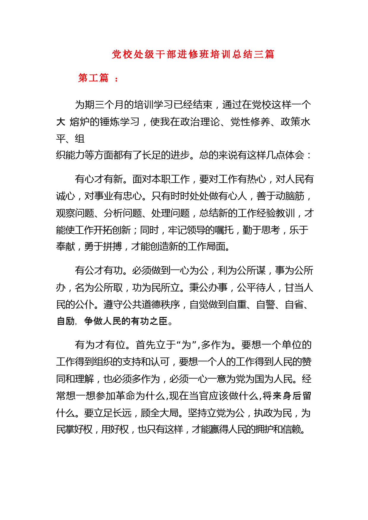 黨校處級干部進修班培訓總結三篇第工篇:為期三個月的培訓學習已經(jīng)結束,通過在黨校這樣一個大熔爐的錘煉學習,使我在政治理論、黨性修養(yǎng)、政策水平、組織能力等方面都有了長足的進步??偟膩碚f有這樣幾點體會:有心才有新。面對本職工作,要對工作有熱心,對人民有誠心,對事業(yè)有忠心。只有時時處處做有心人,善于動腦筋,觀察問題、分析問題、處理問題,總結新的工作經(jīng)驗教訓,才能使工作開拓創(chuàng)新;同時,牢記領導的囑托,勤于思考,樂于奉獻,勇于拼搏,才能創(chuàng)造新的工作局面。有公才有功。必須做到一心為公,利為公所謀,事為公所辦,名為公所取,功為民所立。秉公辦...