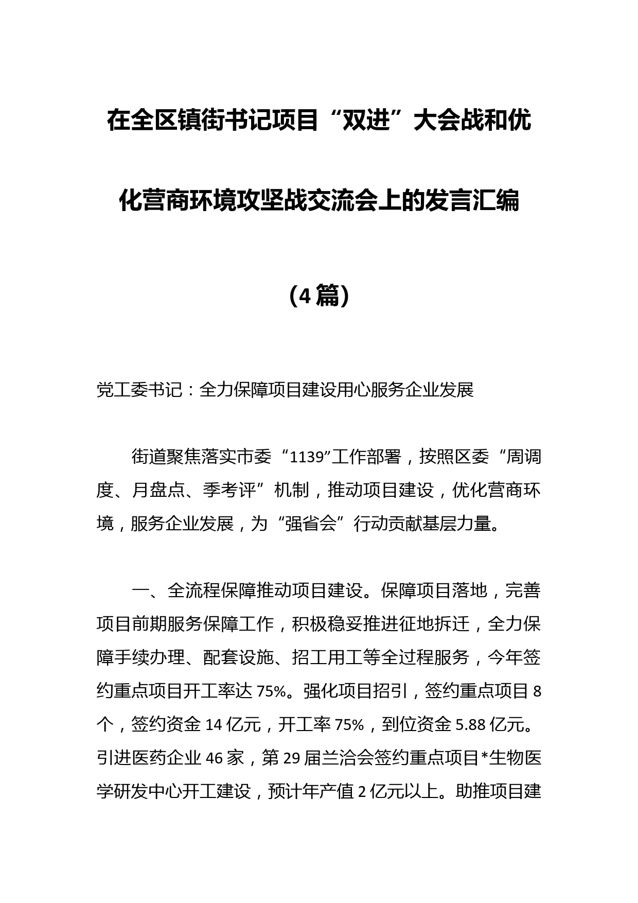(4篇)在全區(qū)鎮(zhèn)街書記項目“雙進”大會戰(zhàn)和優(yōu)化營商環(huán)境攻堅戰(zhàn)交流會上的發(fā)言匯編VIP免費