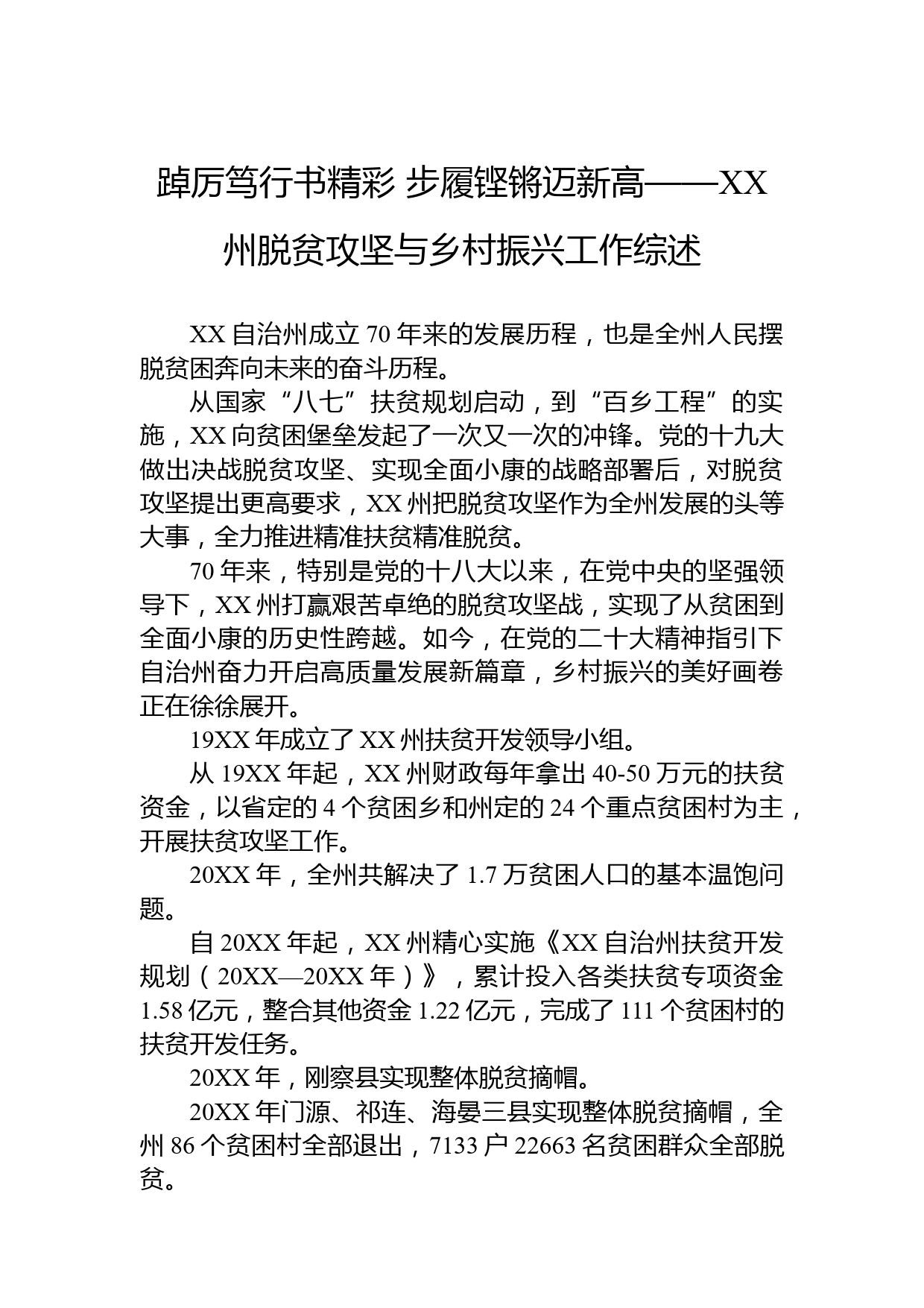 踔厲篤行書(shū)精彩步履鏗鏘邁新高——XX州脫貧攻堅(jiān)與鄉(xiāng)村振興工作綜述XX自治州成立70年來(lái)的發(fā)展歷程,也是全州人民擺脫貧困奔向未來(lái)的奮斗歷程。從國(guó)家“八七”扶貧規(guī)劃啟動(dòng),到“百鄉(xiāng)工程”的實(shí)施,XX向貧困堡壘發(fā)起了一次又一次的沖鋒。黨的十九大做出決戰(zhàn)脫貧攻堅(jiān)、實(shí)現(xiàn)全面小康的戰(zhàn)略部署后,對(duì)脫貧攻堅(jiān)提出更高要求,XX州把脫貧攻堅(jiān)作為全州發(fā)展的頭等大事,全力推進(jìn)精準(zhǔn)扶貧精準(zhǔn)脫貧。70年來(lái),特別是黨的十八大以來(lái),在黨中央的堅(jiān)強(qiáng)領(lǐng)導(dǎo)下,XX州打贏艱苦卓絕的脫貧攻堅(jiān)戰(zhàn),實(shí)現(xiàn)了從貧困到全面小康的歷史性跨越。如今,在黨的二十大精神指引下自治州奮力開(kāi)啟高質(zhì)量發(fā)展...