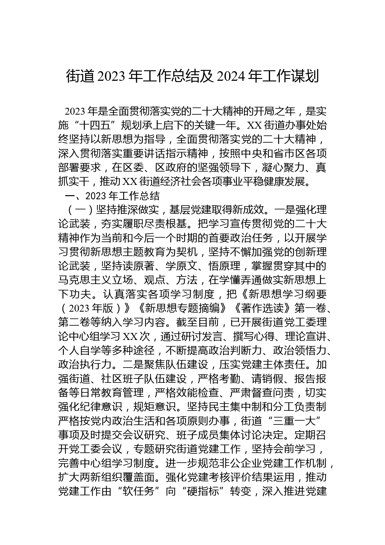 街道2023年工作總結(jié)及2024年工作謀劃2023年是全面貫徹落實黨的二十大精神的開局之年,是實施“十四五”規(guī)劃承上啟下的關(guān)鍵一年。XX街道辦事處始終堅持以新思想為指導(dǎo),全面貫徹落實黨的二十大精神,深入貫徹落實重要講話指示精神,按照中央和省市區(qū)各項部署要求,在區(qū)委、區(qū)政府的堅強領(lǐng)導(dǎo)下,凝心聚力、真抓實干,推動XX街道經(jīng)濟社會各項事業(yè)平穩(wěn)健康發(fā)展。一、2023年工作總結(jié)(一)堅持推深做實,基層黨建取得新成效。一是強化理論武裝,夯實履職盡責(zé)根基。把學(xué)習(xí)宣傳貫徹黨的二十大精神作為當(dāng)前和今后一個時期的首要政治任務(wù),以開展學(xué)習(xí)貫徹新思想主題教育為契機,堅...