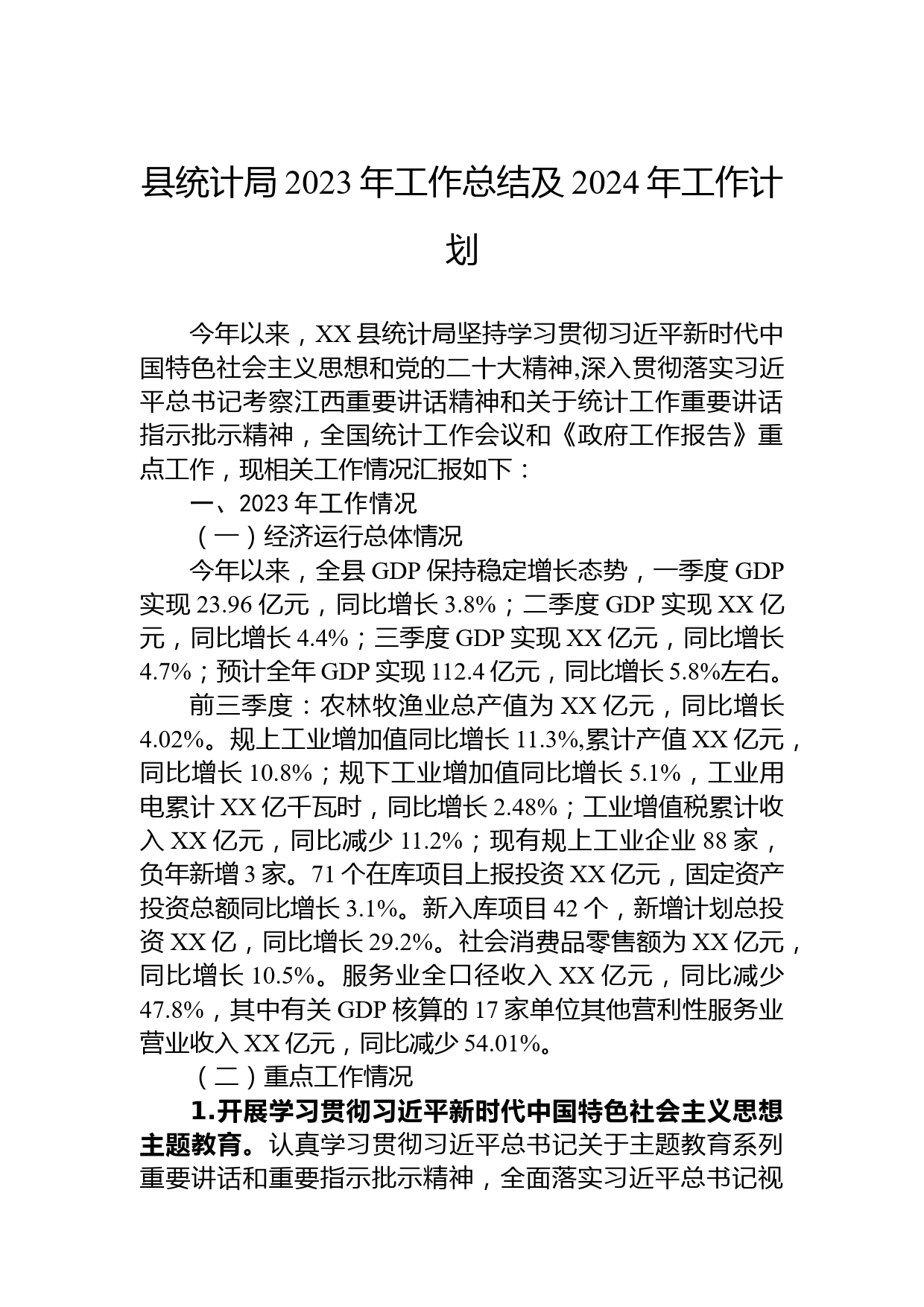 縣統(tǒng)計(jì)局2023年工作總結(jié)及2024年工作計(jì)劃今年以來(lái),XX縣統(tǒng)計(jì)局堅(jiān)持學(xué)習(xí)貫徹習(xí)近平新時(shí)代中國(guó)特色社會(huì)主義思想和黨的二十大精神,深入貫徹落實(shí)習(xí)近平總書(shū)記考察江西重要講話精神和關(guān)于統(tǒng)計(jì)工作重要講話指示批示精神,全國(guó)統(tǒng)計(jì)工作會(huì)議和《政府工作報(bào)告》重點(diǎn)工作,現(xiàn)相關(guān)工作情況匯報(bào)如下:一、2023年工作情況(一)經(jīng)濟(jì)運(yùn)行總體情況今年以來(lái),全縣GDP保持穩(wěn)定增長(zhǎng)態(tài)勢(shì),一季度GDP實(shí)現(xiàn)23.96億元,同比增長(zhǎng)3.8%;二季度GDP實(shí)現(xiàn)XX億元,同比增長(zhǎng)4.4%;三季度GDP實(shí)現(xiàn)XX億元,同比增長(zhǎng)4.7%;預(yù)計(jì)全年GDP實(shí)現(xiàn)112.4億元,同比增長(zhǎng)5.8%左右。前三季度:農(nóng)林牧漁業(yè)總產(chǎn)值為XX億元,...
