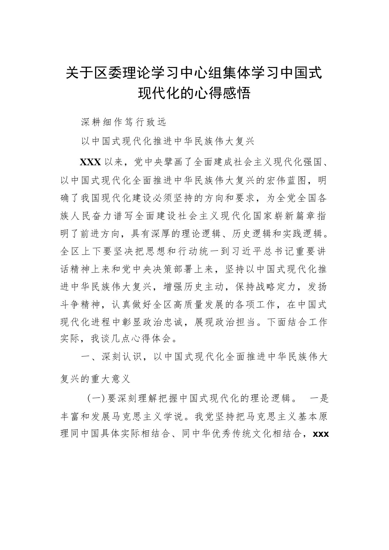 關(guān)于區(qū)委理論學(xué)習(xí)中心組集體學(xué)習(xí)中國式現(xiàn)代化的心得感悟深耕細(xì)作篤行致遠(yuǎn)以中國式現(xiàn)代化推進(jìn)中華民族偉大復(fù)興XXX以來,黨中央擘畫了全面建成社會主義現(xiàn)代化強國、以中國式現(xiàn)代化全面推進(jìn)中華民族偉大復(fù)興的宏偉藍(lán)圖,明確了我國現(xiàn)代化建設(shè)必須堅持的方向和要求,為全黨全國各族人民奮力譜寫全面建設(shè)社會主義現(xiàn)代化國家嶄新篇章指明了前進(jìn)方向,具有深厚的理論邏輯、歷史邏輯和實踐邏輯。全區(qū)上下要堅決把思想和行動統(tǒng)一到習(xí)近平總書記重要講話精神上來和黨中央決策部署上來,堅持以中國式現(xiàn)代化推進(jìn)中華民族偉大復(fù)興,增強歷史主動,保持戰(zhàn)略定力,發(fā)揚斗爭精神,認(rèn)真做...