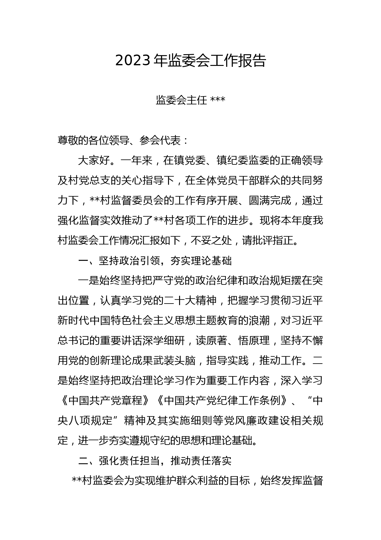 2023年監(jiān)委會工作報告監(jiān)委會主任尊敬的各位領(lǐng)導(dǎo)、參會代表:大家好。一年來,在鎮(zhèn)黨委、鎮(zhèn)紀(jì)委監(jiān)委的正確領(lǐng)導(dǎo)及村黨總支的關(guān)心指導(dǎo)下,在全體黨員干部群眾的共同努力下,村監(jiān)督委員會的工作有序開展、圓滿完成,通過強化監(jiān)督實效推動了村各項工作的進步?,F(xiàn)將本年度我村監(jiān)委會工作情況匯報如下,不妥之處,請批評指正。一、堅持政治引領(lǐng),夯實理論基礎(chǔ)一是始終堅持把嚴(yán)守黨的政治紀(jì)律和政治規(guī)矩擺在突出位置,認(rèn)真學(xué)習(xí)黨的二十大精神,把握學(xué)習(xí)貫徹習(xí)近平新時代中國特色社會主義思想主題教育的浪潮,對習(xí)近平總書記的重要講話深學(xué)細(xì)研,讀原著、悟原理,堅持不懈用黨的創(chuàng)...
