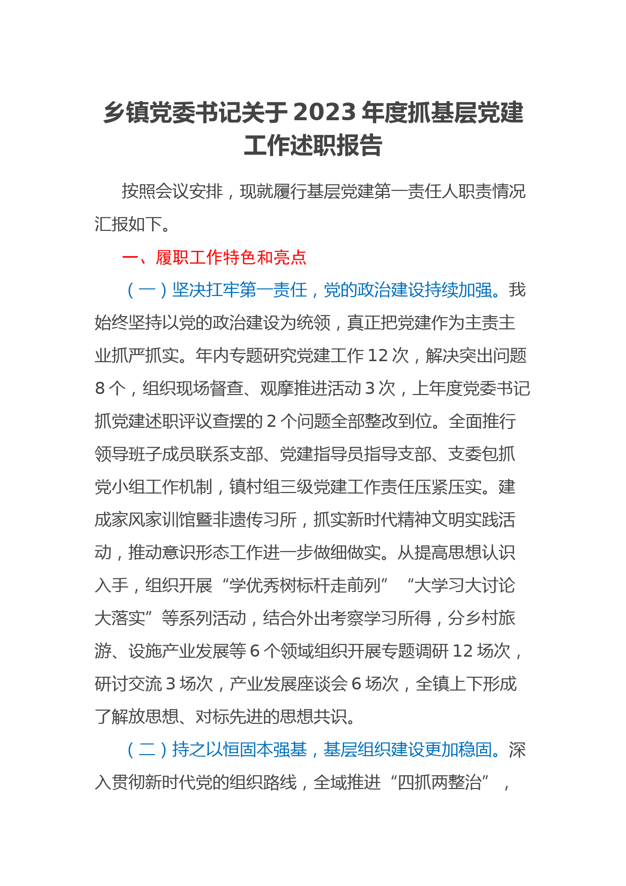 鄉(xiāng)鎮(zhèn)黨委書記關(guān)于2023年度抓基層黨建工作述職報告VIP免費(fèi)