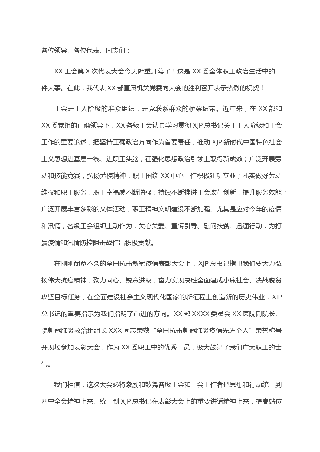 各位領導、各位代表、同志們:XX工會第X次代表大會今天隆重開幕了!這是XX委全體職工政治生活中的一件大事。在此,我代表XX部直屬機關黨委向大會的勝利召開表示熱烈的祝賀!工會是工人階級的群眾組織,是黨聯系群...