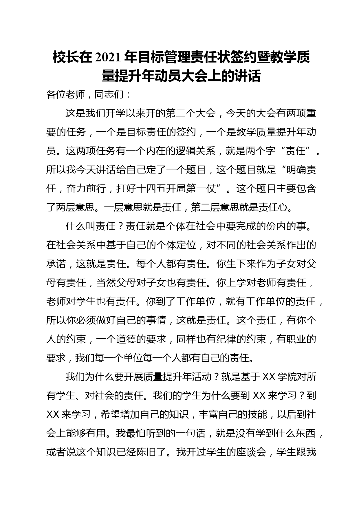 校長在2021年目標(biāo)管理責(zé)任狀簽約暨教學(xué)質(zhì)量提升年動員大會上的講話各位老師,同志們:這是我們開學(xué)以來開的第二個(gè)大會,今天的大會有兩項(xiàng)重要的任務(wù),一個(gè)是目標(biāo)責(zé)任的簽約,一個(gè)是教學(xué)質(zhì)量提升年動員。這兩項(xiàng)任...
