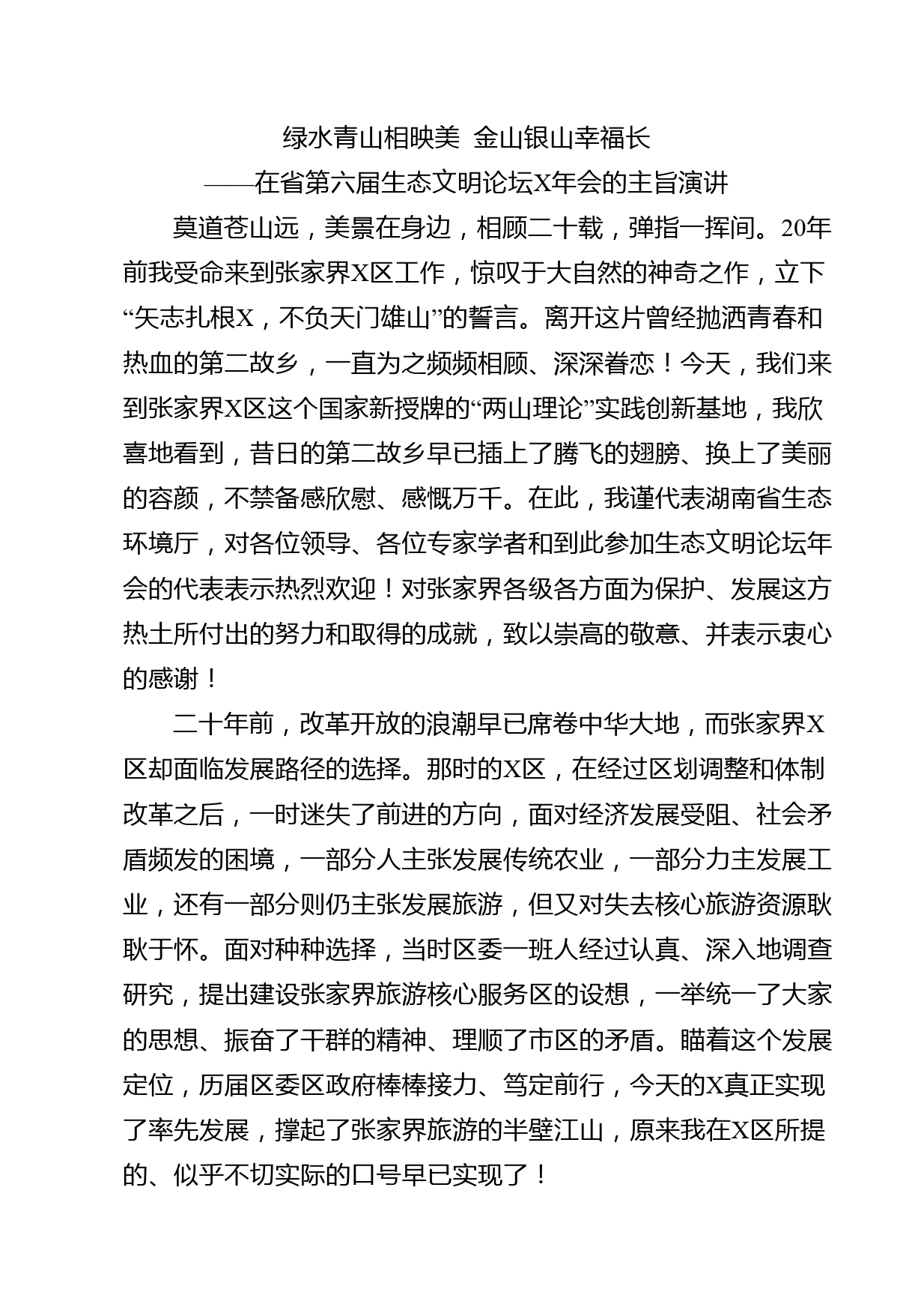 綠水青山相映美金山銀山幸福長(zhǎng)——在省第六屆生態(tài)文明論壇X年會(huì)的主旨演講莫道蒼山遠(yuǎn),美景在身邊,相顧二十載,彈指一揮間。20年前我受命來(lái)到張家界X區(qū)工作,驚嘆于大自然的神奇之作,立下“矢志扎根X,不負(fù)天門...