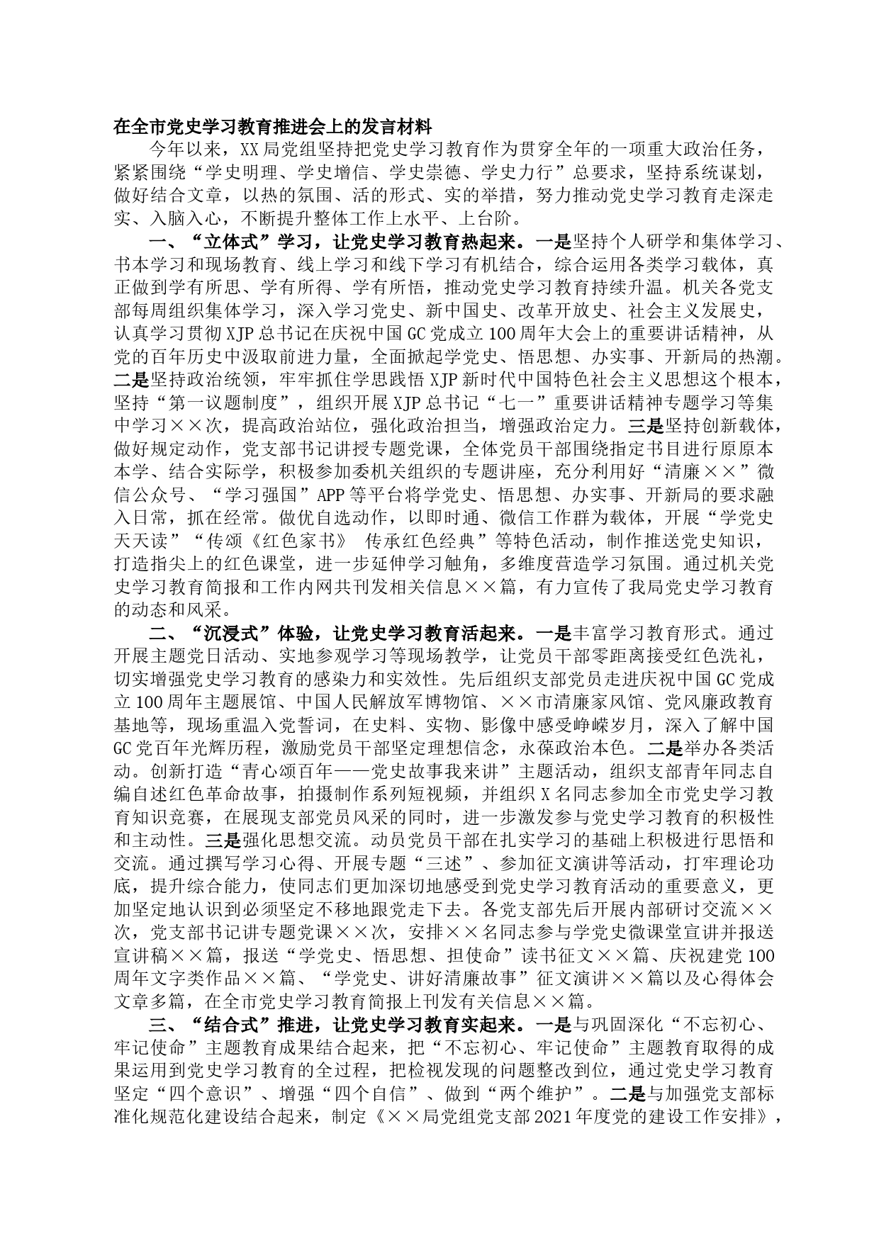 在全市黨史學(xué)習(xí)教育推進(jìn)會(huì)上的發(fā)言材料今年以來(lái),XX局黨組堅(jiān)持把黨史學(xué)習(xí)教育作為貫穿全年的一項(xiàng)重大政治任務(wù),緊緊圍繞“學(xué)史明理、學(xué)史增信、學(xué)史崇德、學(xué)史力行”總要求,堅(jiān)持系統(tǒng)謀劃,做好結(jié)合文章,以熱的...