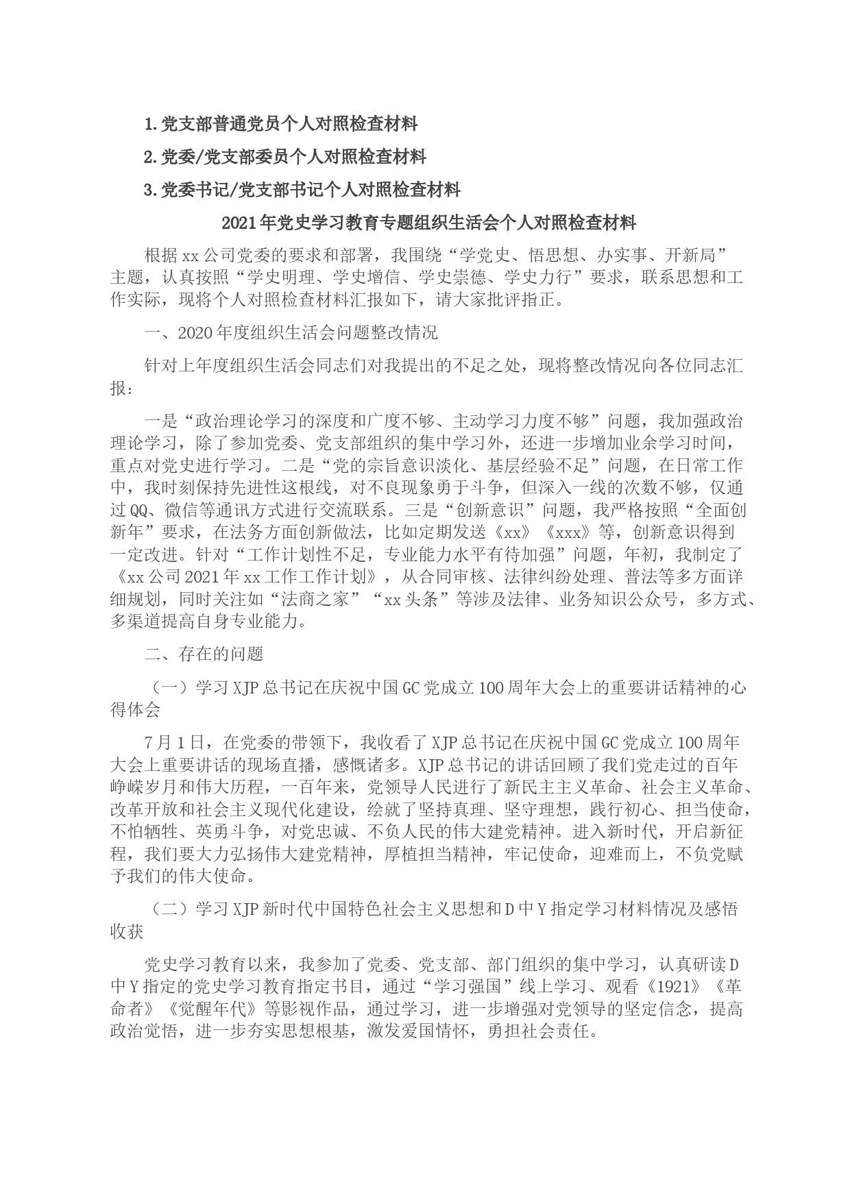 1.黨支部普通黨員個(gè)人對(duì)照檢查材料2.黨委/黨支部委員個(gè)人對(duì)照檢查材料3.黨委書(shū)記/黨支部書(shū)記個(gè)人對(duì)照檢查材料2021年黨史學(xué)習(xí)教育專題組織生活會(huì)個(gè)人對(duì)照檢查材料根據(jù)xx公司黨委的要求和部署,我圍繞“學(xué)黨史、悟...