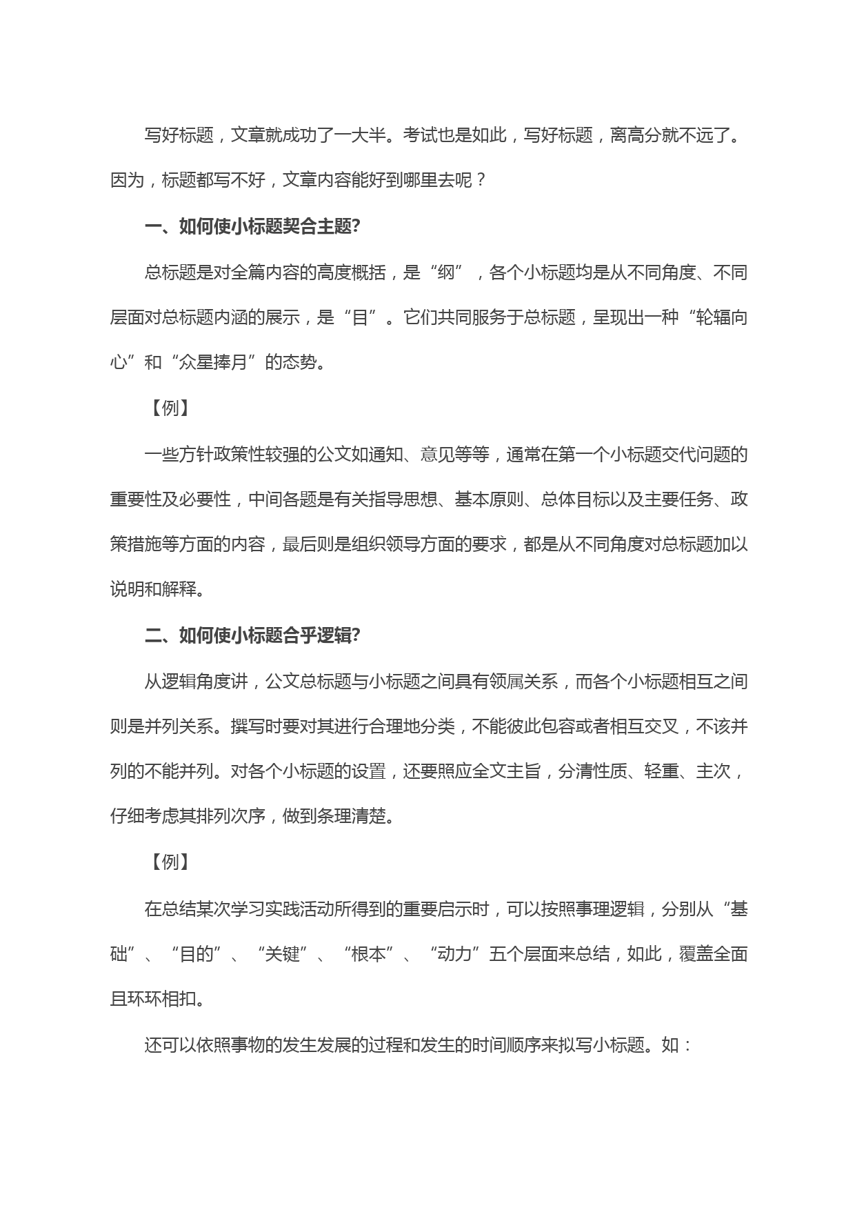 寫好標題,文章就成功了一大半??荚囈彩侨绱?,寫好標題,離高分就不遠了。因為,標題都寫不好,文章內(nèi)容能好到哪里去呢?一、如何使小標題契合主題?總標題是對全篇內(nèi)容的高度概括,是“綱”,各個小標題均是從...