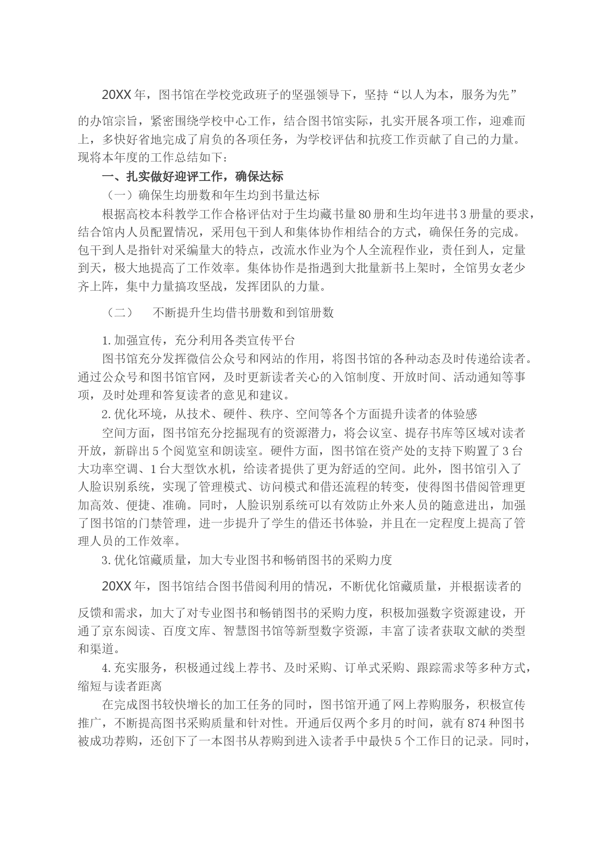 20XX年,圖書(shū)館在學(xué)校黨政班子的堅(jiān)強(qiáng)領(lǐng)導(dǎo)下,堅(jiān)持“以人為本,服務(wù)為先”的辦館宗旨,緊密?chē)@學(xué)校中心工作,結(jié)合圖書(shū)館實(shí)際,扎實(shí)開(kāi)展各項(xiàng)工作,迎難而上,多快好省地完成了肩負(fù)的各項(xiàng)任務(wù),為學(xué)校評(píng)估和抗疫工...