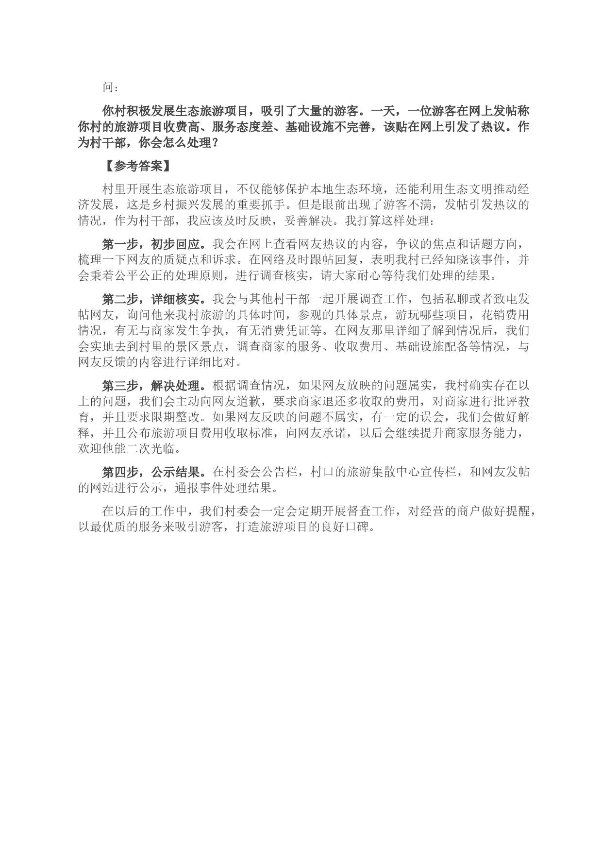 問(wèn):你村積極發(fā)展生態(tài)旅游項(xiàng)目,吸引了大量的游客。一天,一位游客在網(wǎng)上發(fā)帖稱你村的旅游項(xiàng)目收費(fèi)高、服務(wù)態(tài)度差、基礎(chǔ)設(shè)施不完善,該貼在網(wǎng)上引發(fā)了熱議。作為村干部,你會(huì)怎么處理?【參考答案】村里開展生態(tài)...