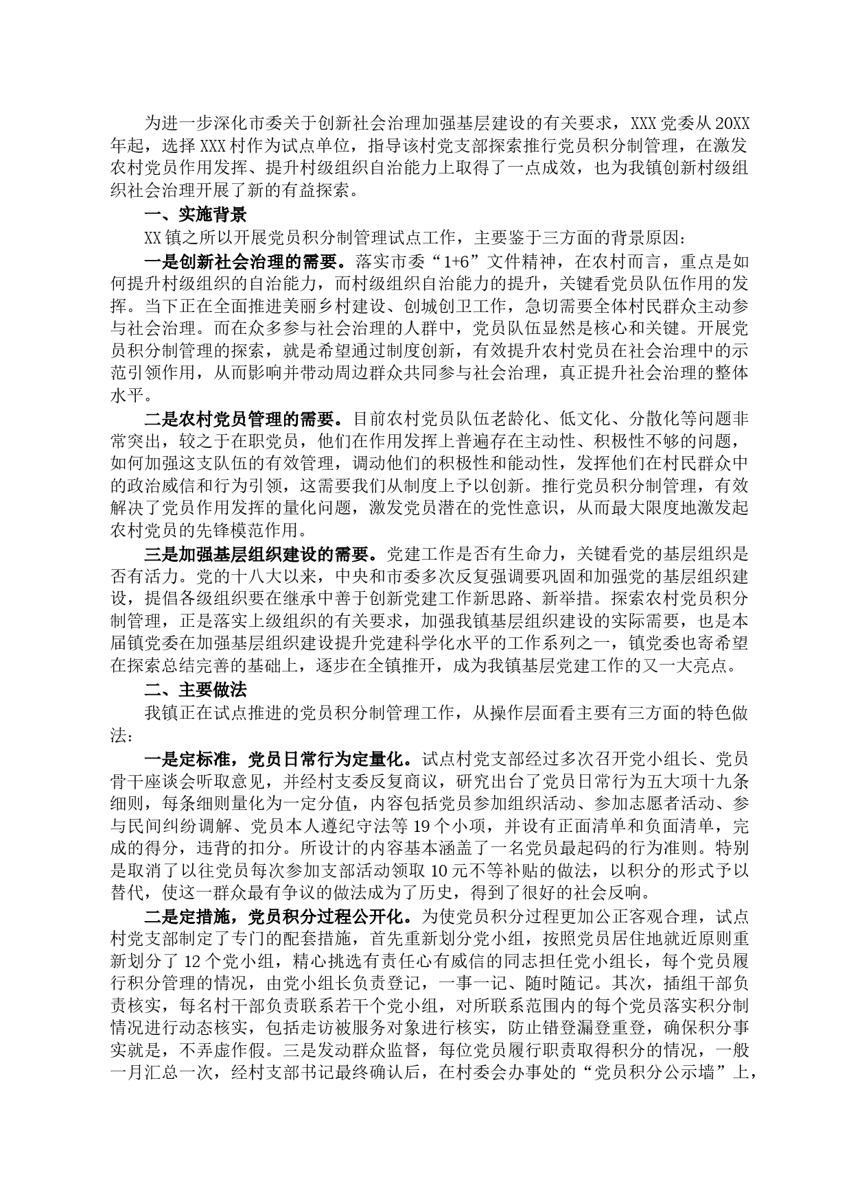 為進(jìn)一步深化市委關(guān)于創(chuàng)新社會治理加強(qiáng)基層建設(shè)的有關(guān)要求,XXX黨委從20XX年起,選擇XXX村作為試點(diǎn)單位,指導(dǎo)該村黨支部探索推行黨員積分制管理,在激發(fā)農(nóng)村黨員作用發(fā)揮、提升村級組織自治能力上取得了一點(diǎn)成效...