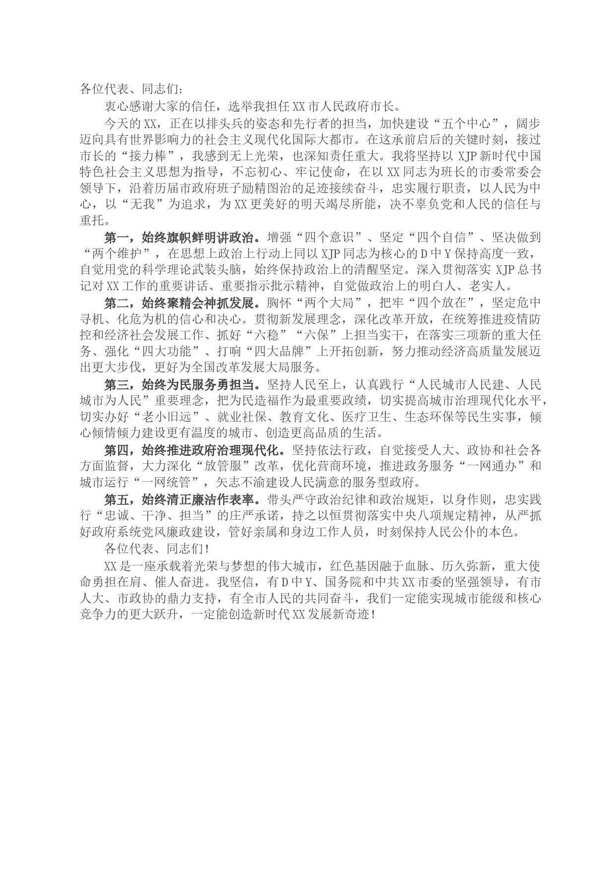 各位代表、同志們:衷心感謝大家的信任,選舉我擔(dān)任XX市人民政府市長。今天的XX,正在以排頭兵的姿態(tài)和先行者的擔(dān)當(dāng),加快建設(shè)“五個中心”,闊步邁向具有世界影響力的社會主義現(xiàn)代化國際大都市。在這承前啟后的...