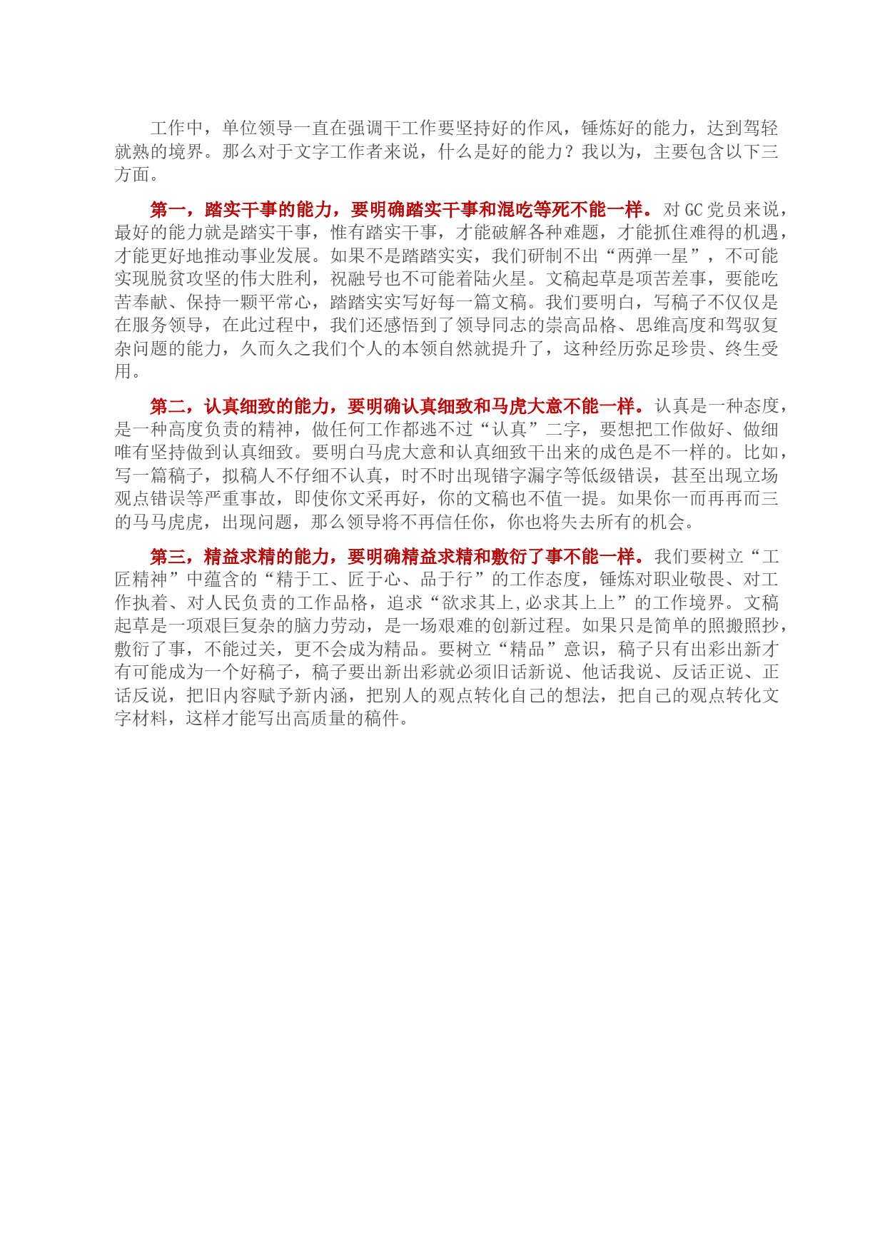 工作中,單位領(lǐng)導(dǎo)一直在強(qiáng)調(diào)干工作要堅(jiān)持好的作風(fēng),錘煉好的能力,達(dá)到駕輕就熟的境界。那么對(duì)于文字工作者來(lái)說(shuō),什么是好的能力?我以為,主要包含以下三方面。第一,踏實(shí)干事的能力,要明確踏實(shí)干事和混吃等死...