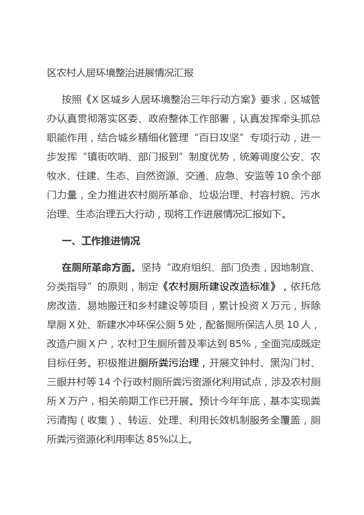 區(qū)農(nóng)村人居環(huán)境整治進展情況匯報按照《X區(qū)城鄉(xiāng)人居環(huán)境整治三年行動方案》要求,區(qū)城管辦認真貫徹落實區(qū)委、政府整體工作部署,認真發(fā)揮牽頭抓總職能作用,結(jié)合城鄉(xiāng)精細化管理“百日攻堅”專項行動,進一步發(fā)揮“...