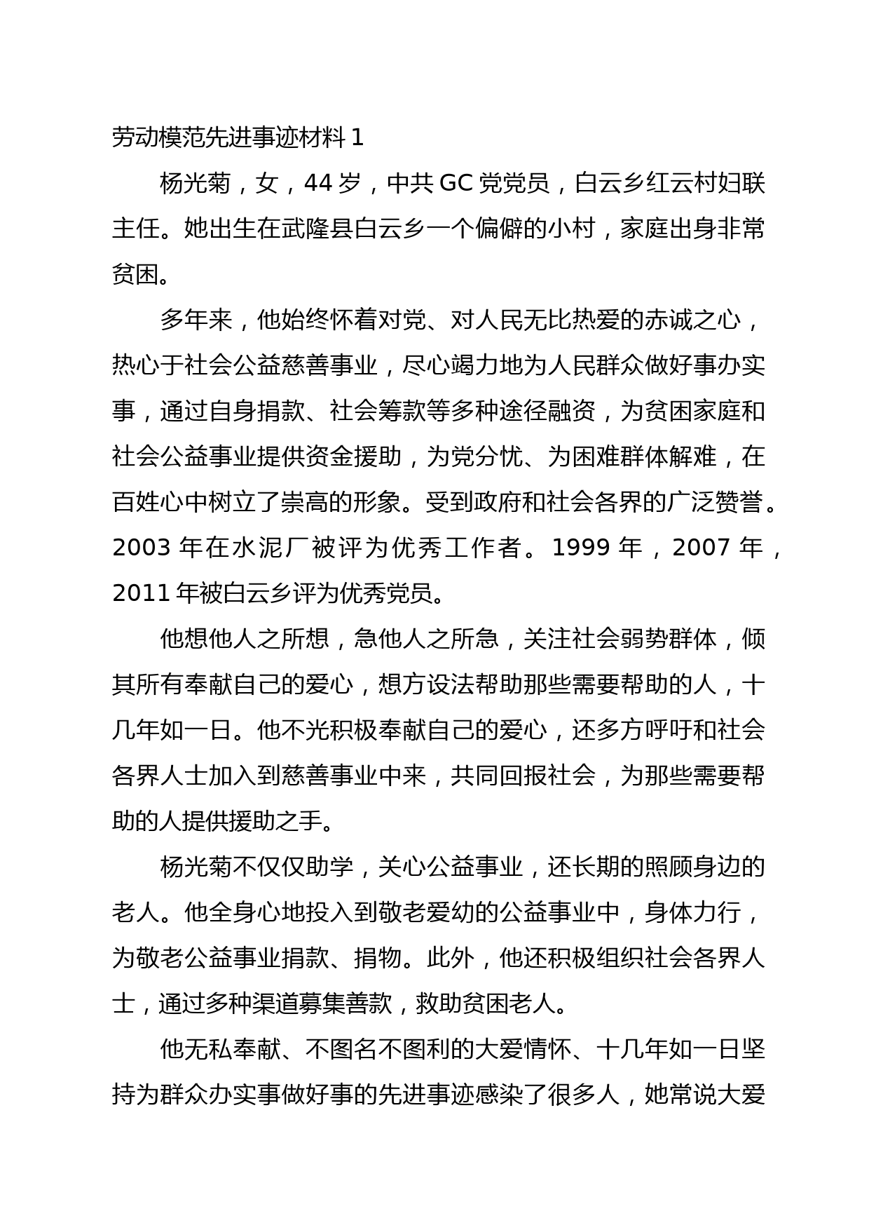 勞動(dòng)模范先進(jìn)事跡材料1楊光菊,女,44歲,中共GC黨黨員,白云鄉(xiāng)紅云村婦聯(lián)主任。她出生在武隆縣白云鄉(xiāng)一個(gè)偏僻的小村,家庭出身非常貧困。多年來(lái),他始終懷著對(duì)黨、對(duì)人民無(wú)比熱愛(ài)的赤誠(chéng)之心,熱心于社會(huì)公益慈善...