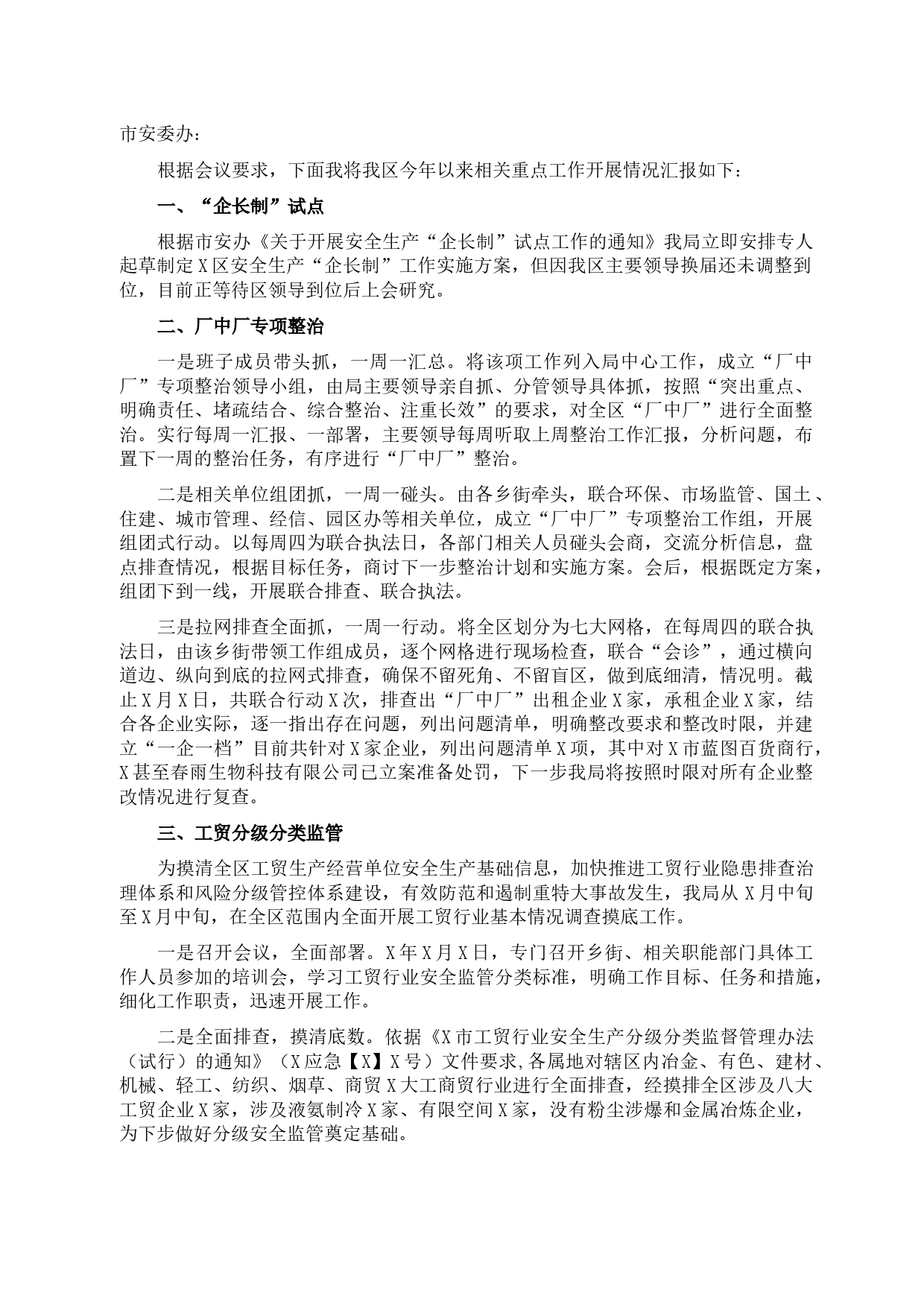 市安委辦:根據(jù)會議要求,下面我將我區(qū)今年以來相關(guān)重點工作開展情況匯報如下:一、“企長制”試點根據(jù)市安辦《關(guān)于開展安全生產(chǎn)“企長制”試點工作的通知》我局立即安排專人起草制定X區(qū)安全生產(chǎn)“企長制”工作實...