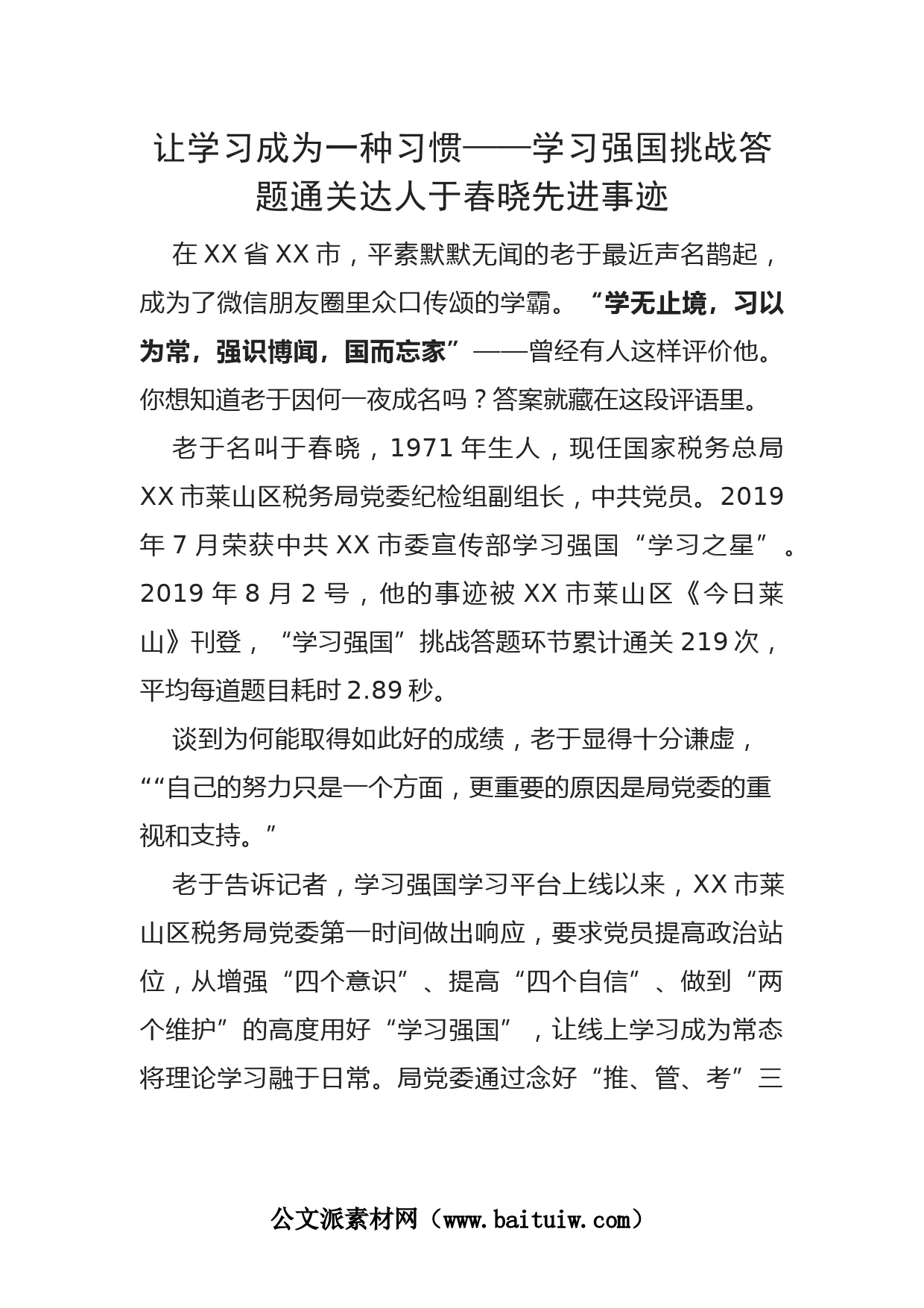 讓學(xué)習(xí)成為一種習(xí)慣——學(xué)習(xí)強國挑戰(zhàn)答題通關(guān)達人于春曉先進事跡在XX省XX市,平素默默無聞的老于最近聲名鵲起,成為了微信朋友圈里眾口傳頌的學(xué)霸?!皩W(xué)無止境,習(xí)以為常,強識博聞,國而忘家”——曾經(jīng)有人這樣...