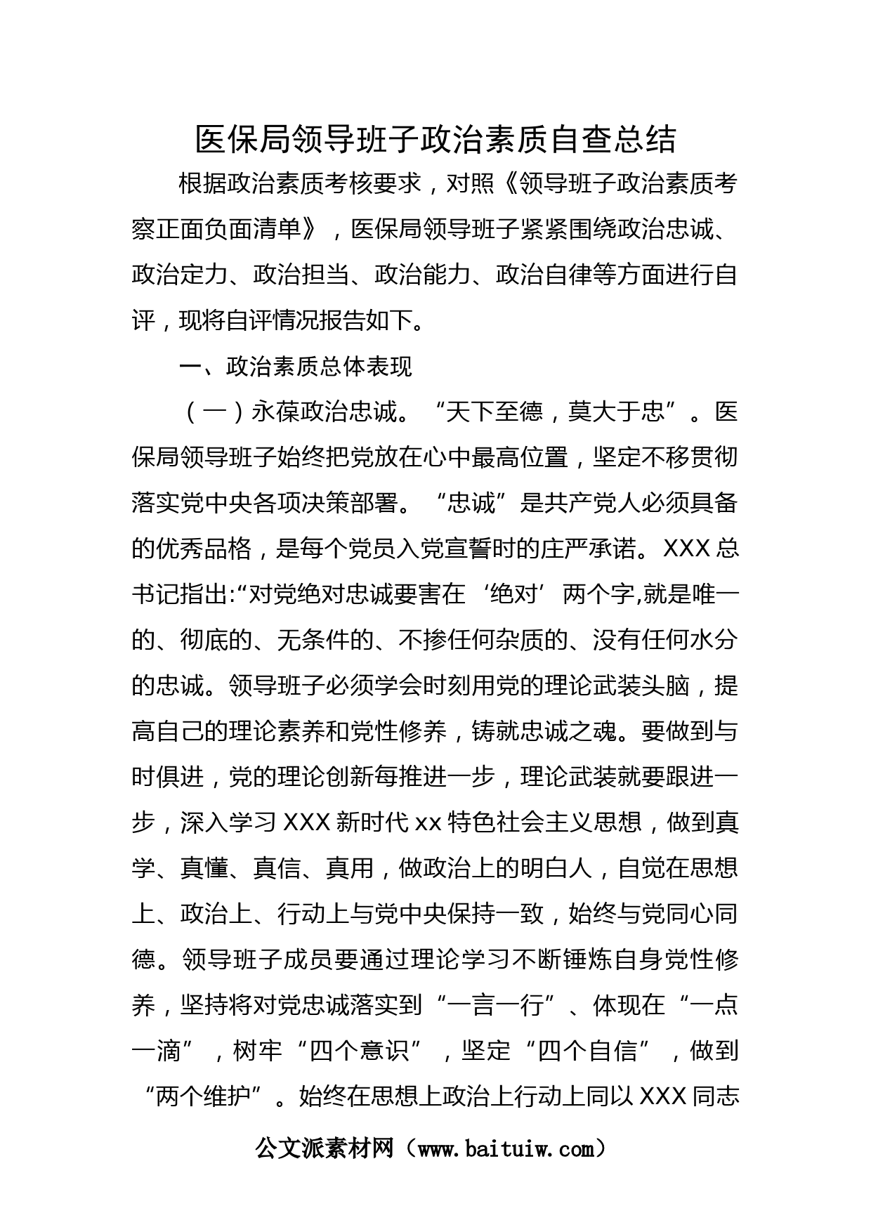 醫(yī)保局領(lǐng)導(dǎo)班子政治素質(zhì)自查總結(jié)根據(jù)政治素質(zhì)考核要求,對照《領(lǐng)導(dǎo)班子政治素質(zhì)考察正面負(fù)面清單》,醫(yī)保局領(lǐng)導(dǎo)班子緊緊圍繞政治忠誠、政治定力、政治擔(dān)當(dāng)、政治能力、政治自律等方面進(jìn)行自評,現(xiàn)將自評情況報(bào)告...