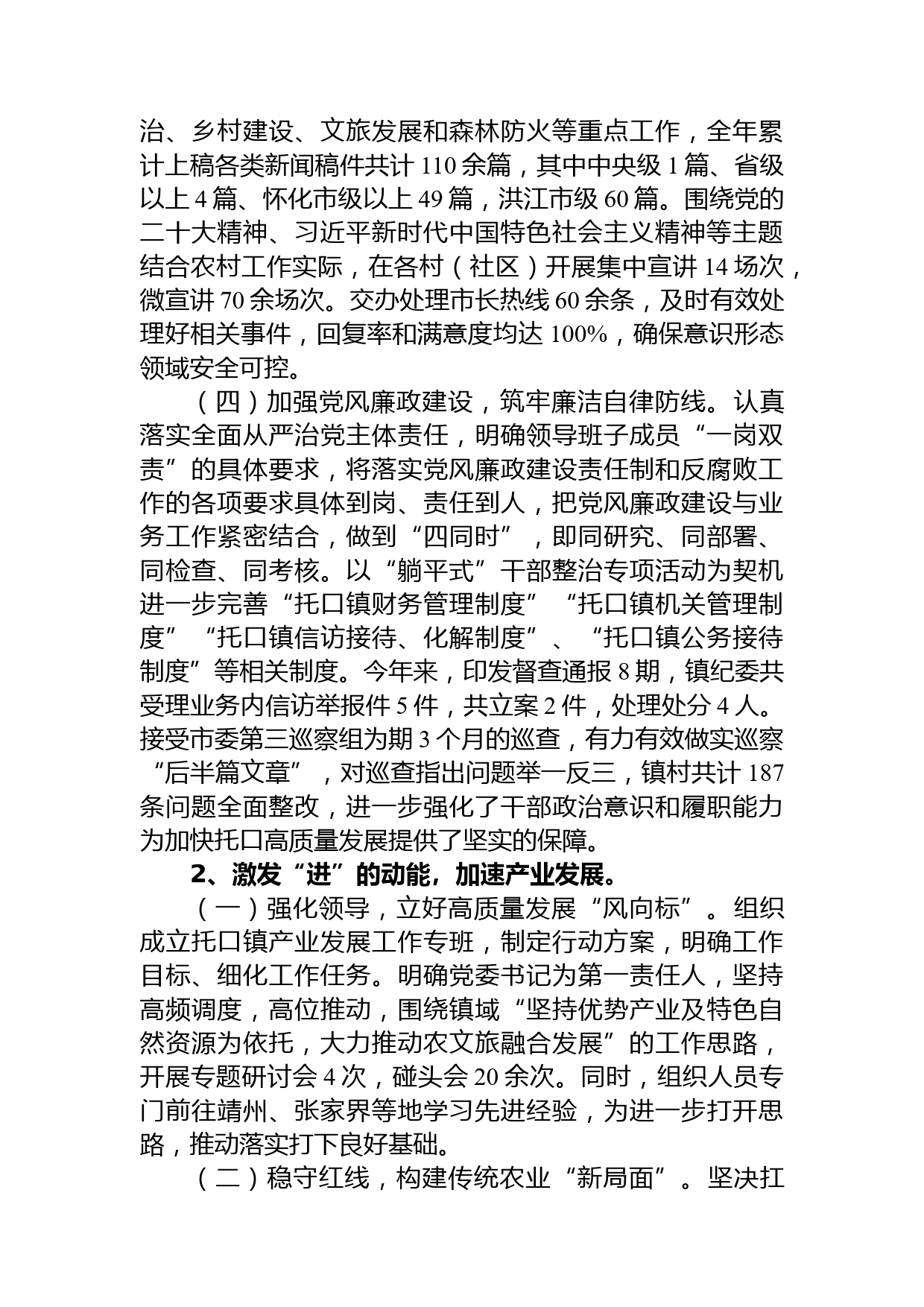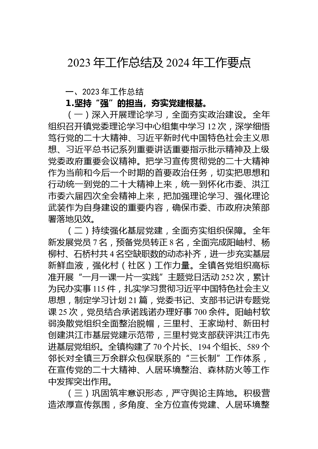 2023年工作總結(jié)及2024年工作要點一、2023年工作總結(jié)1.堅持“強”的擔當,夯實黨建根基。(一)深入開展理論學習,全面夯實政治建設。全年組織召開鎮(zhèn)黨委理論學習中心組集中學習12次,深學細悟篤行黨的二十大精神...
