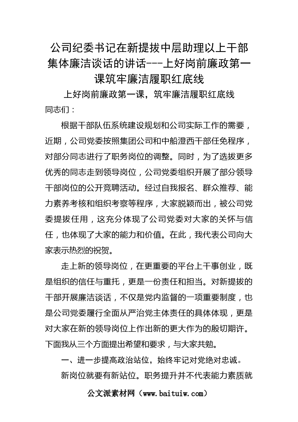 【國(guó)資國(guó)企】公司紀(jì)委書(shū)記在新提拔中層助理以上干部集體廉潔談話(huà)的講話(huà):上好崗前廉政第一課筑牢廉潔履職紅底線(xiàn)VIP免費(fèi)