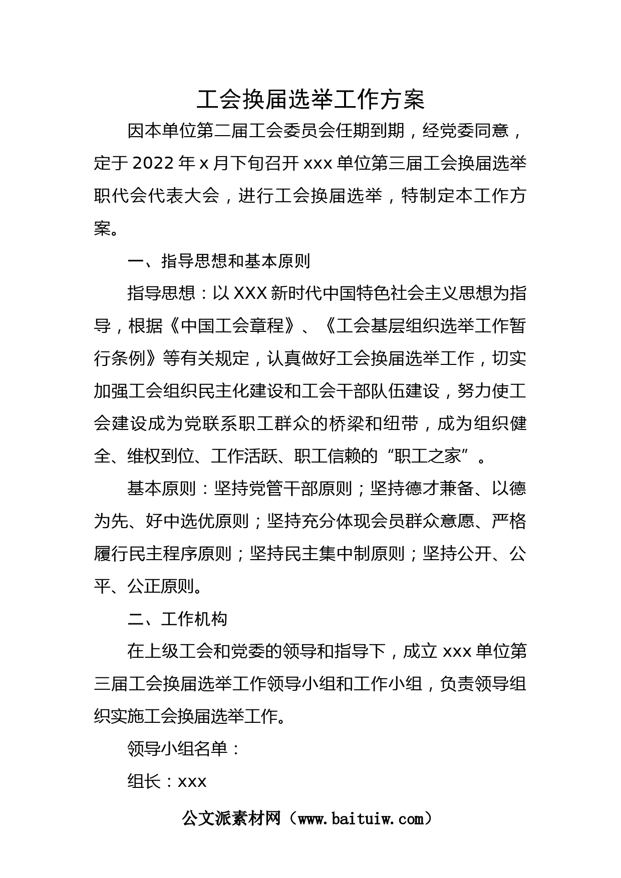 工會(huì)換屆選舉工作方案因本單位第二屆工會(huì)委員會(huì)任期到期,經(jīng)黨委同意,定于2022年x月下旬召開(kāi)xxx單位第三屆工會(huì)換屆選舉職代會(huì)代表大會(huì),進(jìn)行工會(huì)換屆選舉,特制定本工作方案。一、指導(dǎo)思想和基本原則指導(dǎo)思想:...