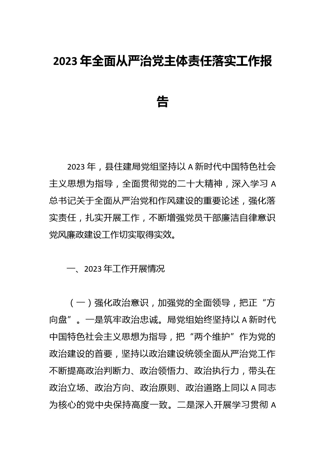 2023年全面從嚴(yán)治黨主體責(zé)任落實(shí)工作報(bào)告2023年,縣住建局黨組堅(jiān)持以A新時(shí)代中國(guó)特色社會(huì)主義思想為指導(dǎo),全面貫徹黨的二十大精神,深入學(xué)習(xí)A總書記關(guān)于全面從嚴(yán)治黨和作風(fēng)建設(shè)的重要論述,強(qiáng)化落實(shí)責(zé)任,扎實(shí)開...
