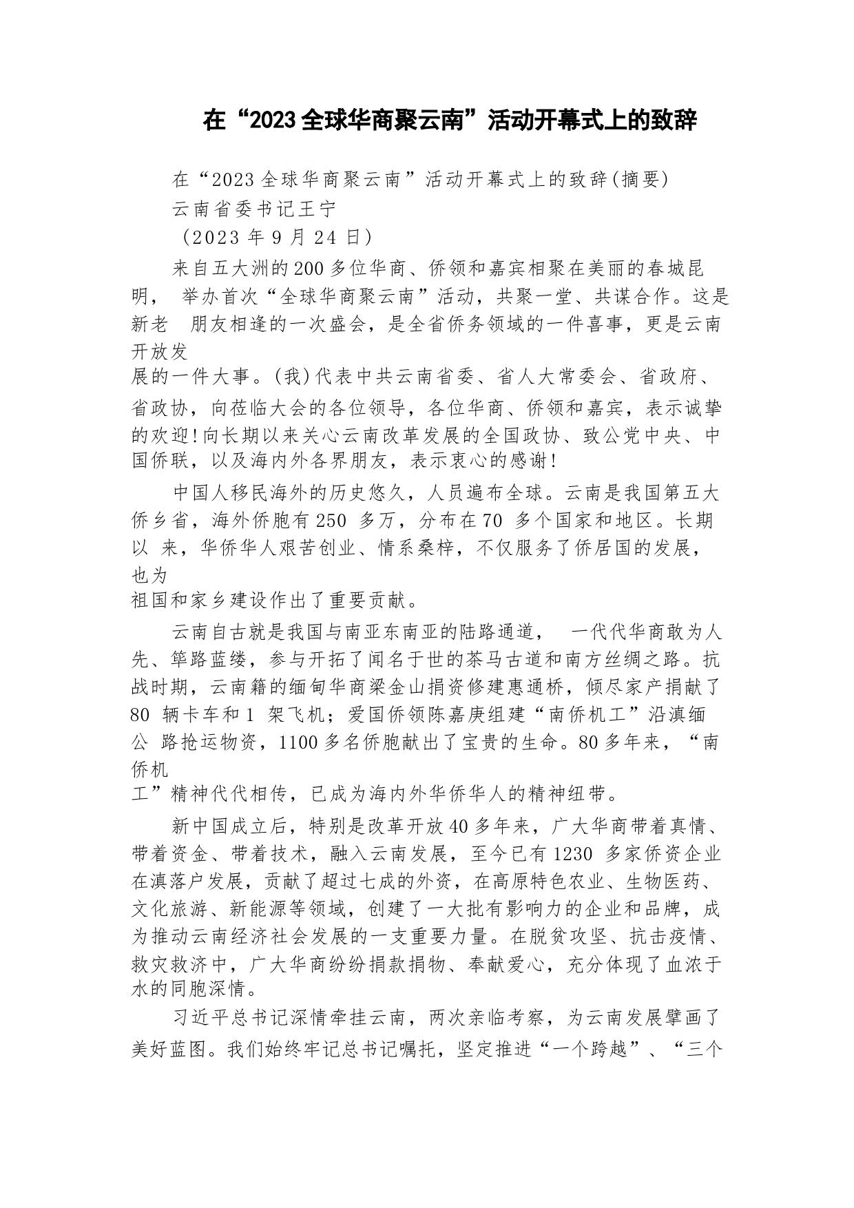 在“2023全球華商聚云南”活動(dòng)開幕式上的致辭VIP免費(fèi)