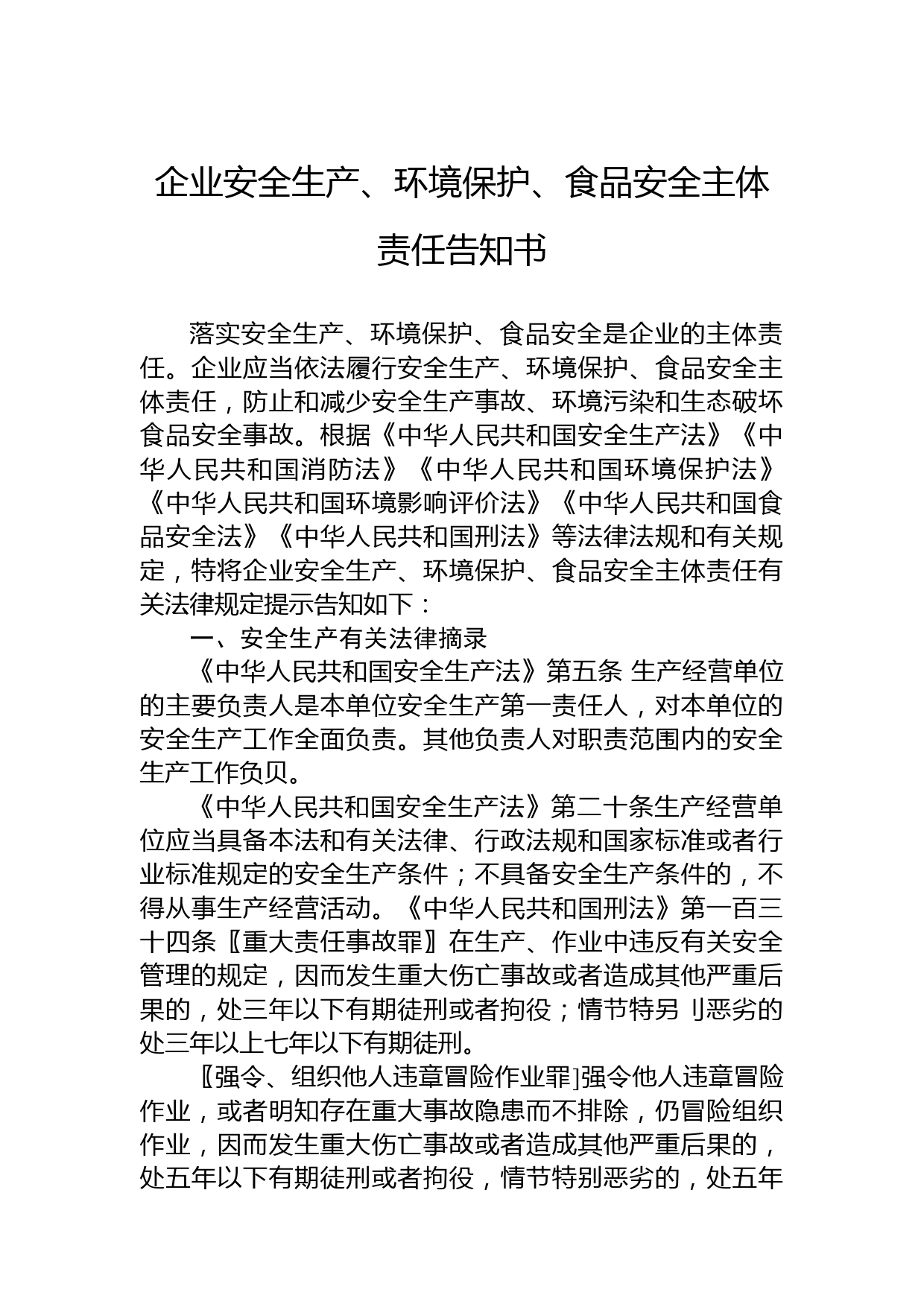 企業(yè)安全生產(chǎn)、環(huán)境保護(hù)、食品安全主體責(zé)任告知書VIP免費(fèi)
