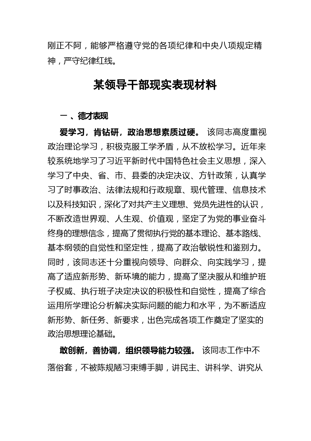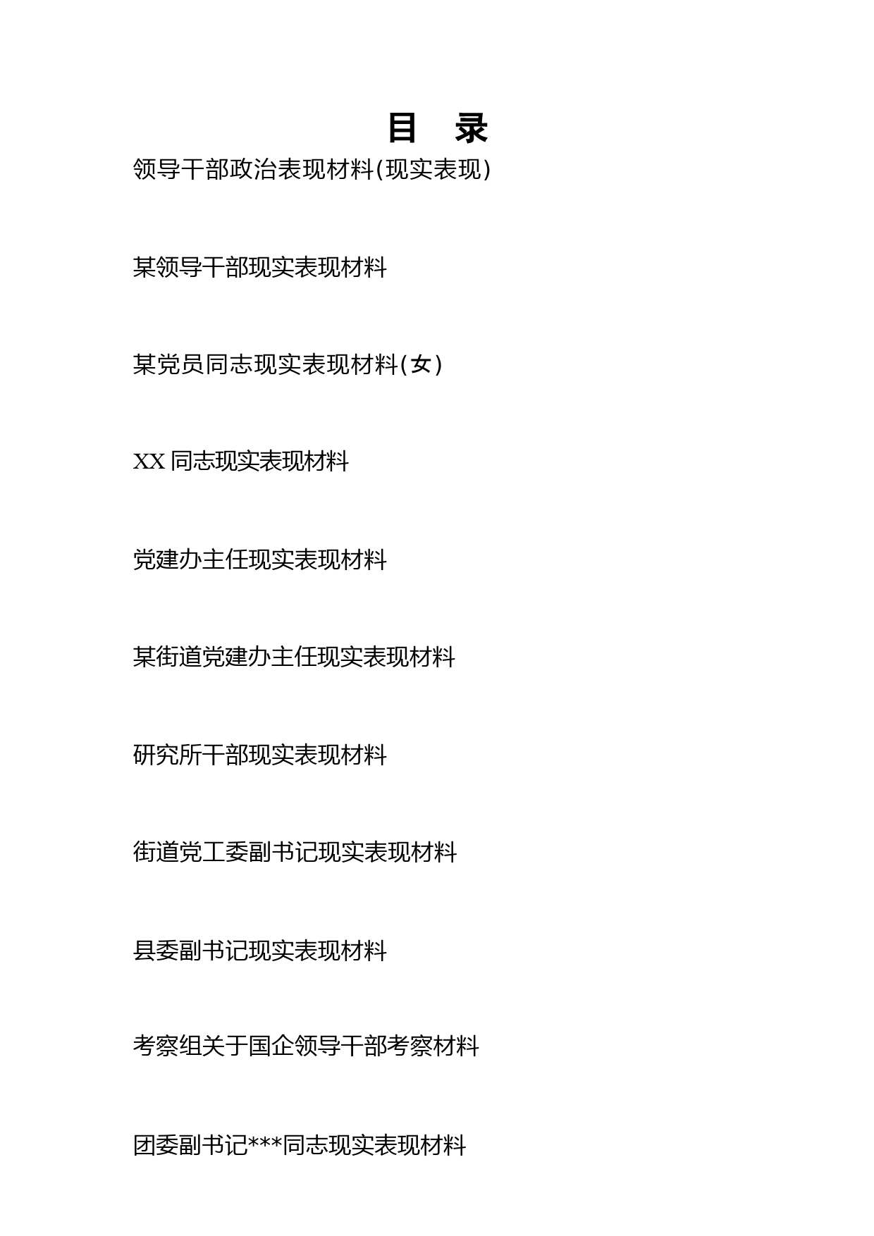 目錄領(lǐng)導干部政治表現(xiàn)材料(現(xiàn)實表現(xiàn))某領(lǐng)導干部現(xiàn)實表現(xiàn)材料某黨員同志現(xiàn)實表現(xiàn)材料(女)XX同志現(xiàn)實表現(xiàn)材料黨建辦主任現(xiàn)實表現(xiàn)材料某街道黨建辦主任現(xiàn)實表現(xiàn)材料研究所干部現(xiàn)實表現(xiàn)材料街道黨工委副書記現(xiàn)實表現(xiàn)...