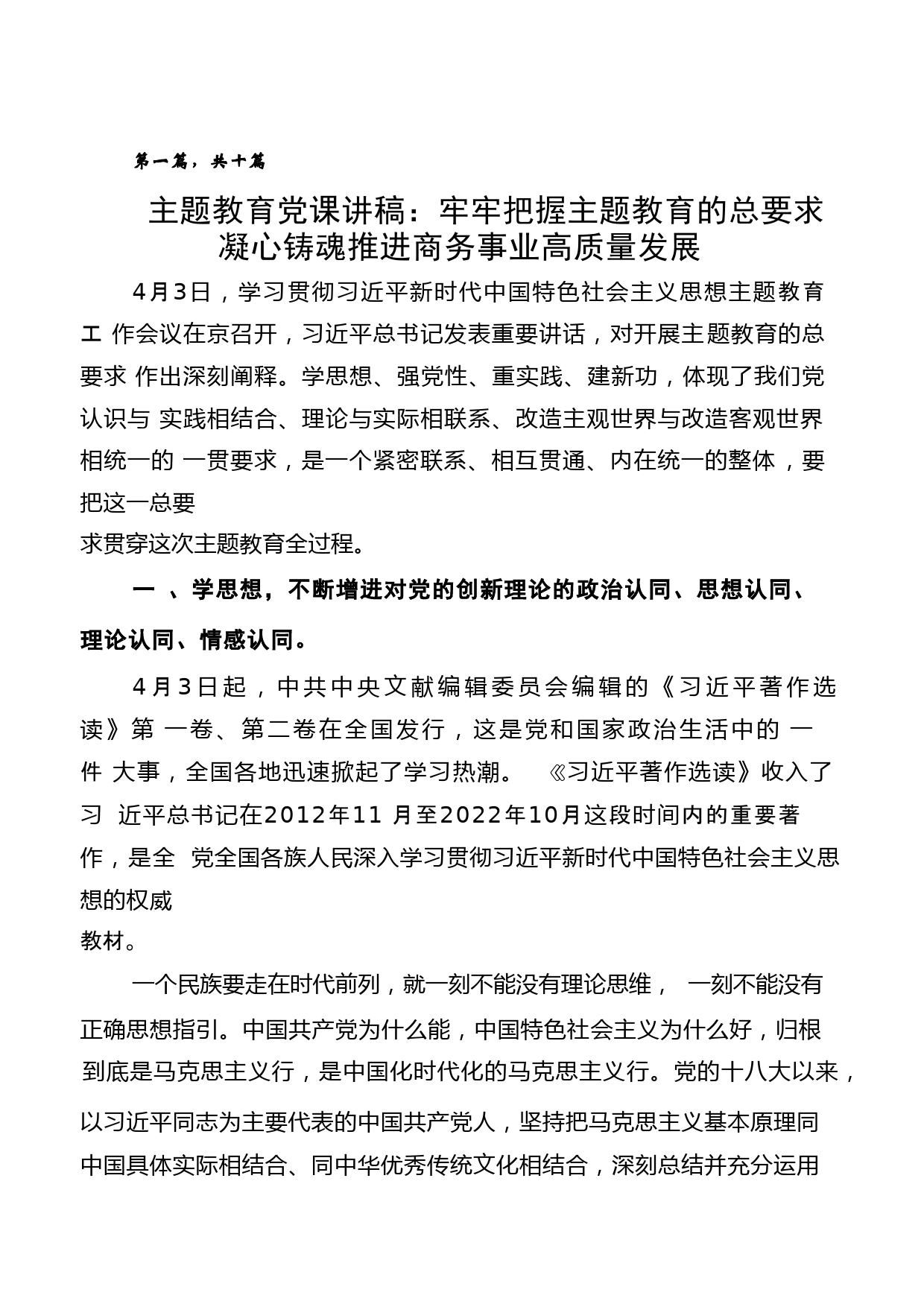 第一篇,共十篇主題教育黨課講稿:牢牢把握主題教育的總要求凝心鑄魂推進商務(wù)事業(yè)高質(zhì)量發(fā)展4月3日,學(xué)習(xí)貫徹習(xí)近平新時代中國特色社會主義思想主題教育工作會議在京召開,習(xí)近平總書記發(fā)表重要講話,對開展主題...